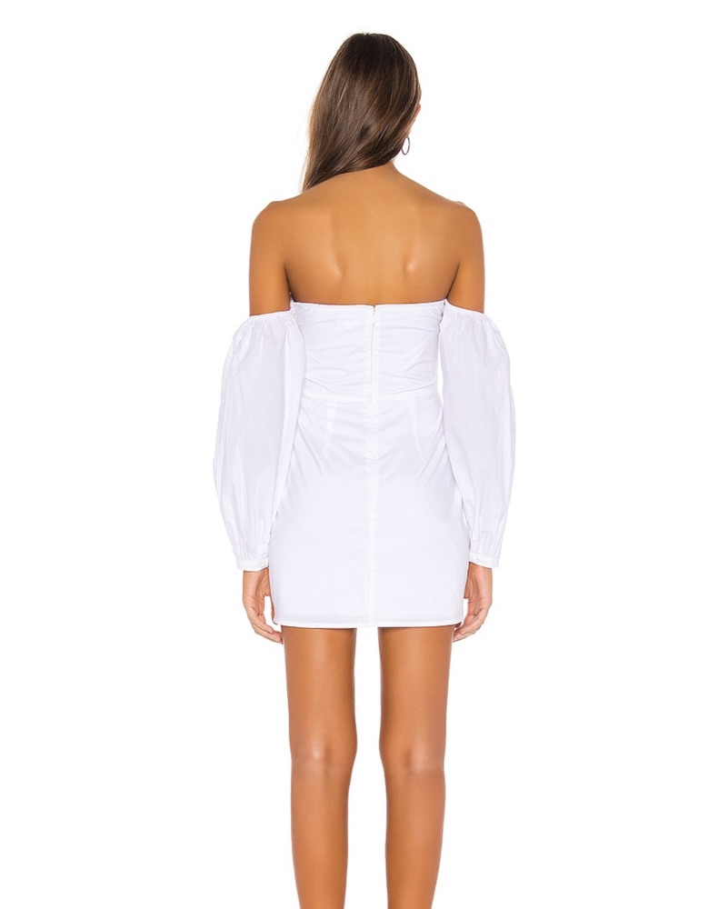 Off the shoulder white dress with ruched sleeves. Perfect condition.