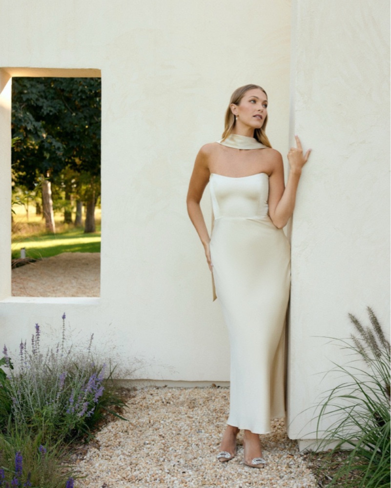 It might be the perfect dress. The subtle sweetheart neckline is flattering on just about everyone, the boned bodice is supportive and comfortable, and the way the bias-cut skirt skims the body and drops beautifully at the ankles is testament to this signature Park & Fifth style. No scarf.