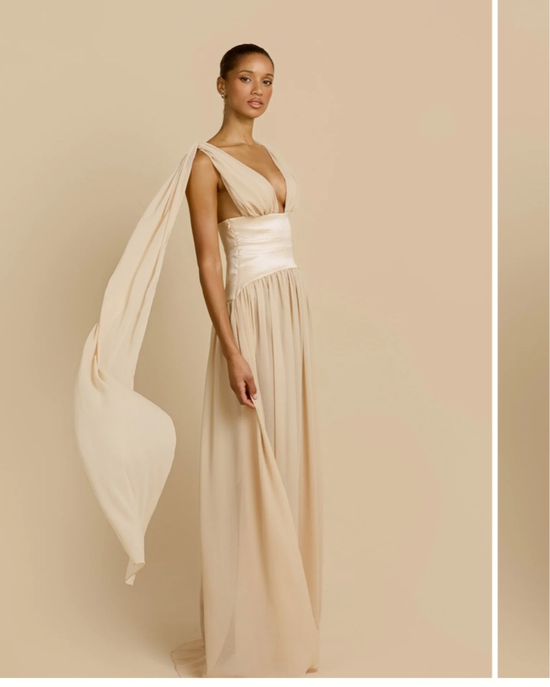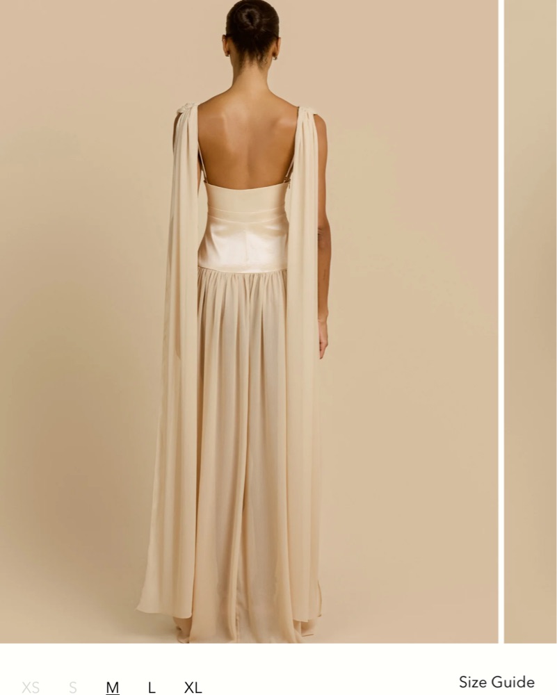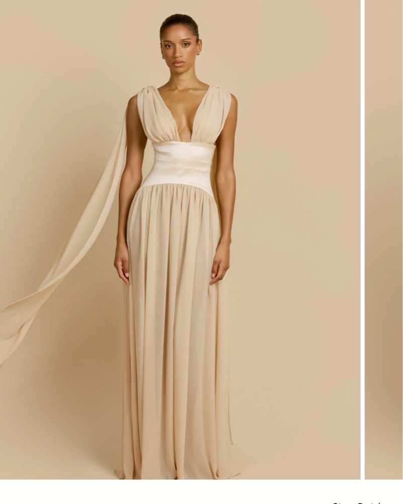 Please dry clean before returning. Floor-length silhouette crafted in a soft champagne hue. She features a plunging v-neckline and soft gathers at the bust. Designed with a contrast taffeta waistband that cinches and elongates the frame. Size S. My waist is 26”
