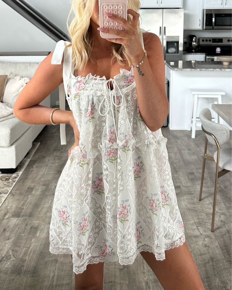 A floral mini lace dress featuring a combination of a delicate floral pattern and intricate lace. A fun & feminine style!