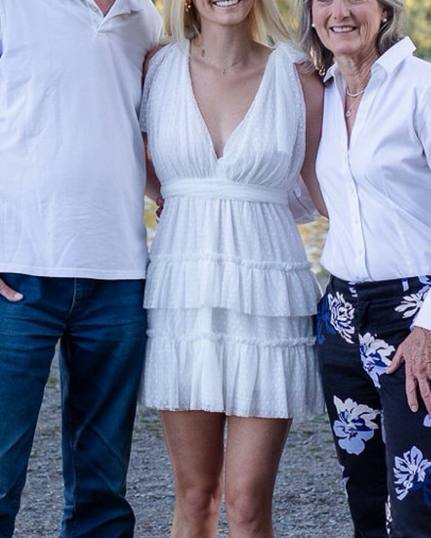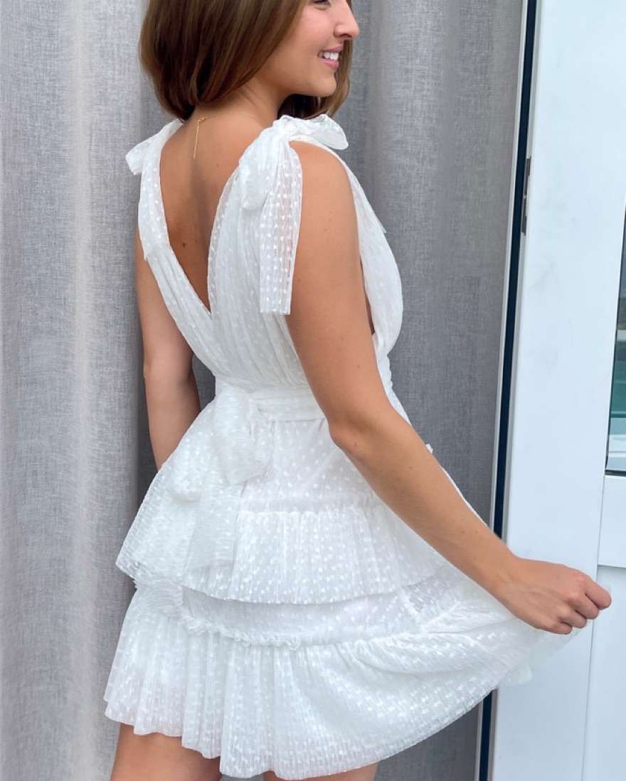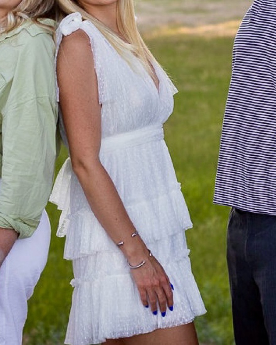 Beautiful white piece for photoshoots, vacations, and date nights. Two bows for straps (adjustable/re-tieable). Optional belt included. V neck and back. Ruffles too!