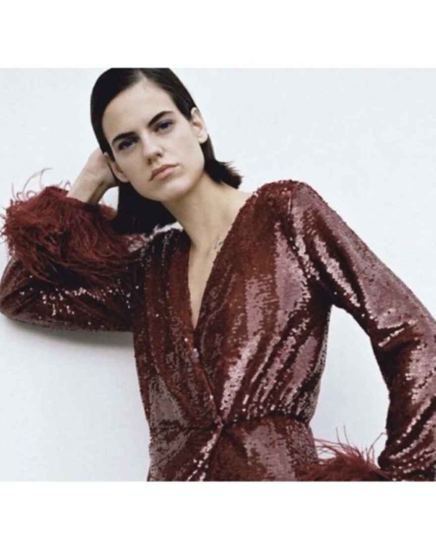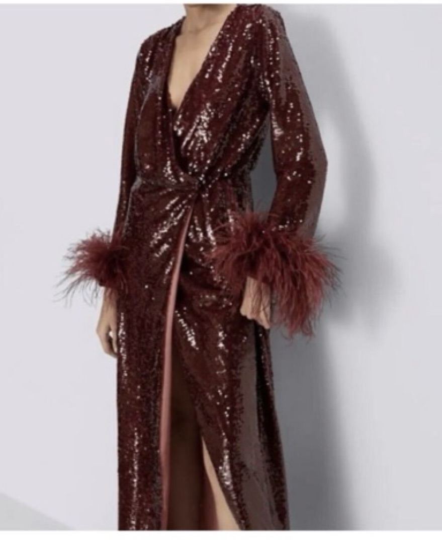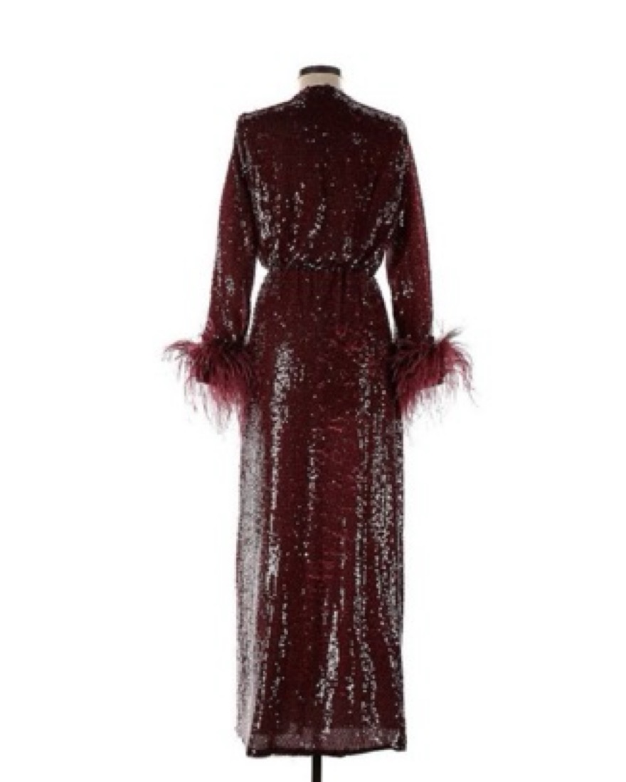 This stunning burgundy sequin gown with feather trim is the perfect showstopper for your next formal event. The glamorous design and bold color will have all eyes on you.