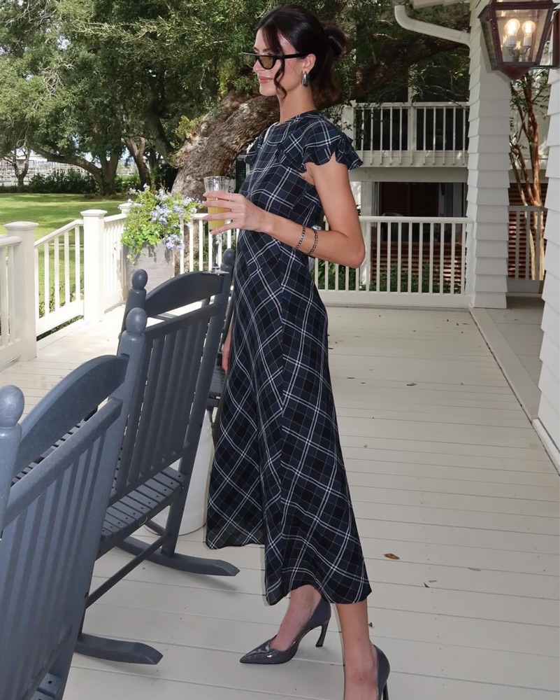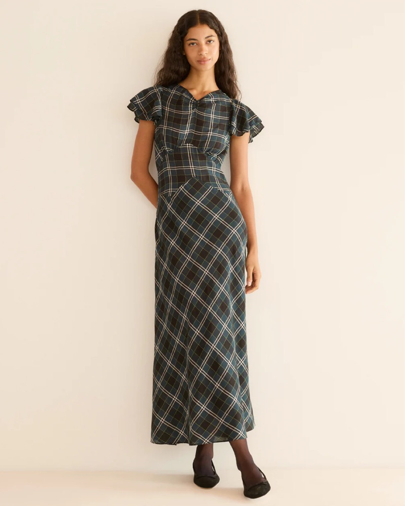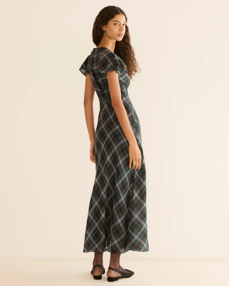 Rendered in soft organic cotton voile and patterned with our yarn-dyed Amble Plaid, the Seraphine Dress draws inspiration from our beloved Rhodia. A high V-neckline with short flutter sleeves is framed by delicate ruching and pointed underbust seams for subtle structure, while a single covered butto