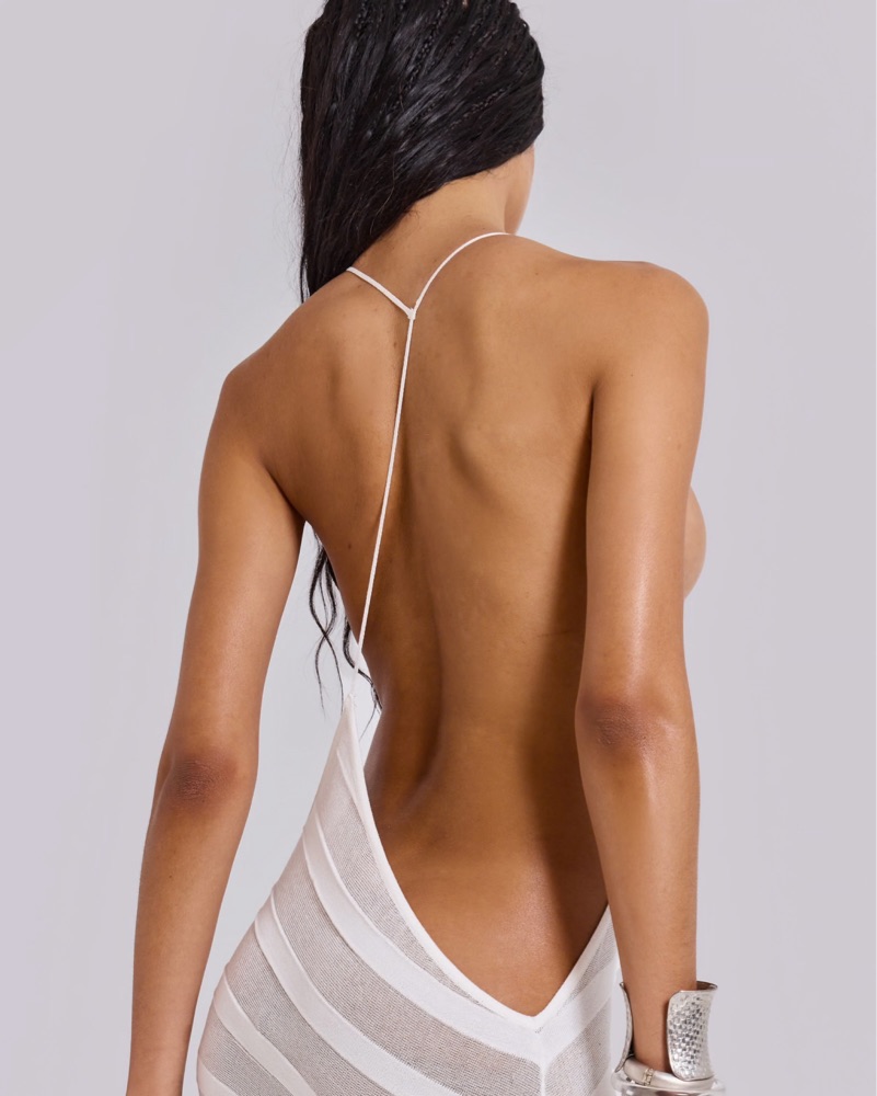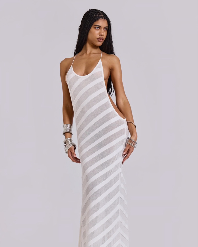 This sleek and stylish striped maxi dress is perfect for a night out or a summer getaway. The fitted silhouette and deep V-neckline create a flattering and feminine look.