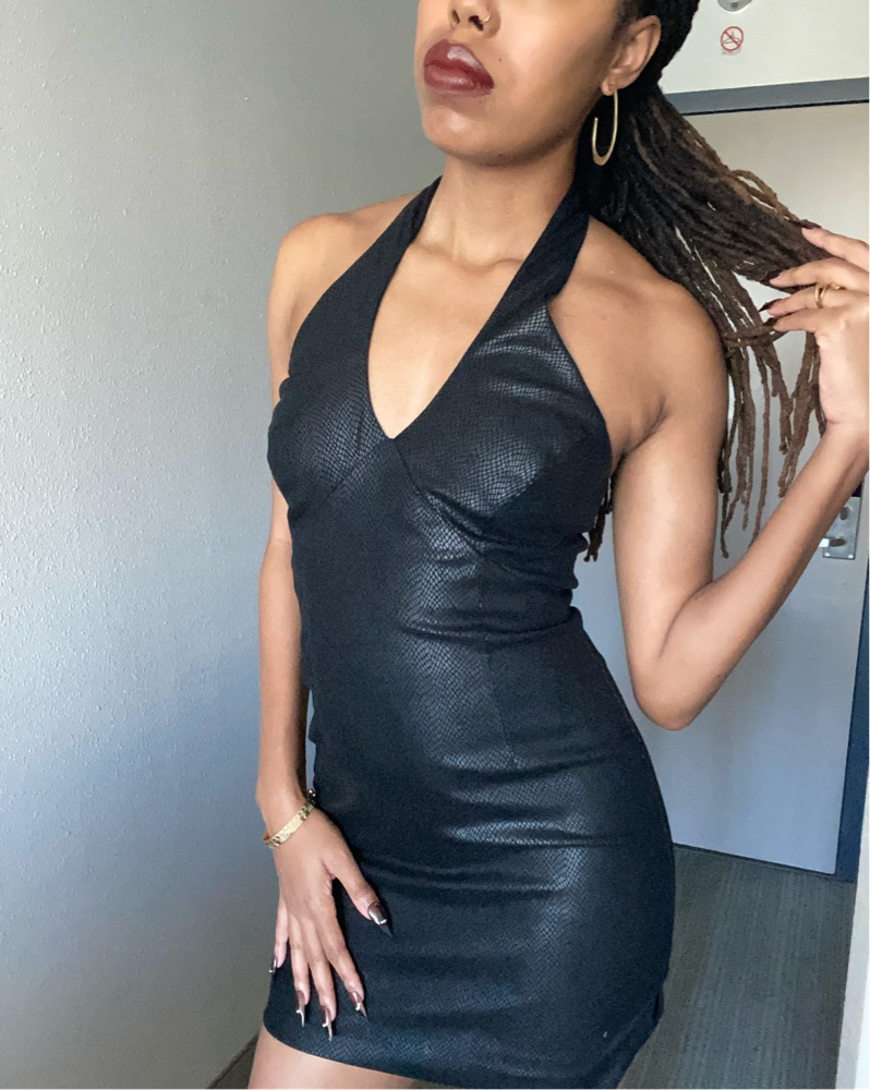 This chic halter-style dress in a sleek faux leather fabric is perfect for a night out. Its figure-hugging silhouette and revealing neckline create a sultry yet sophisticated look.
