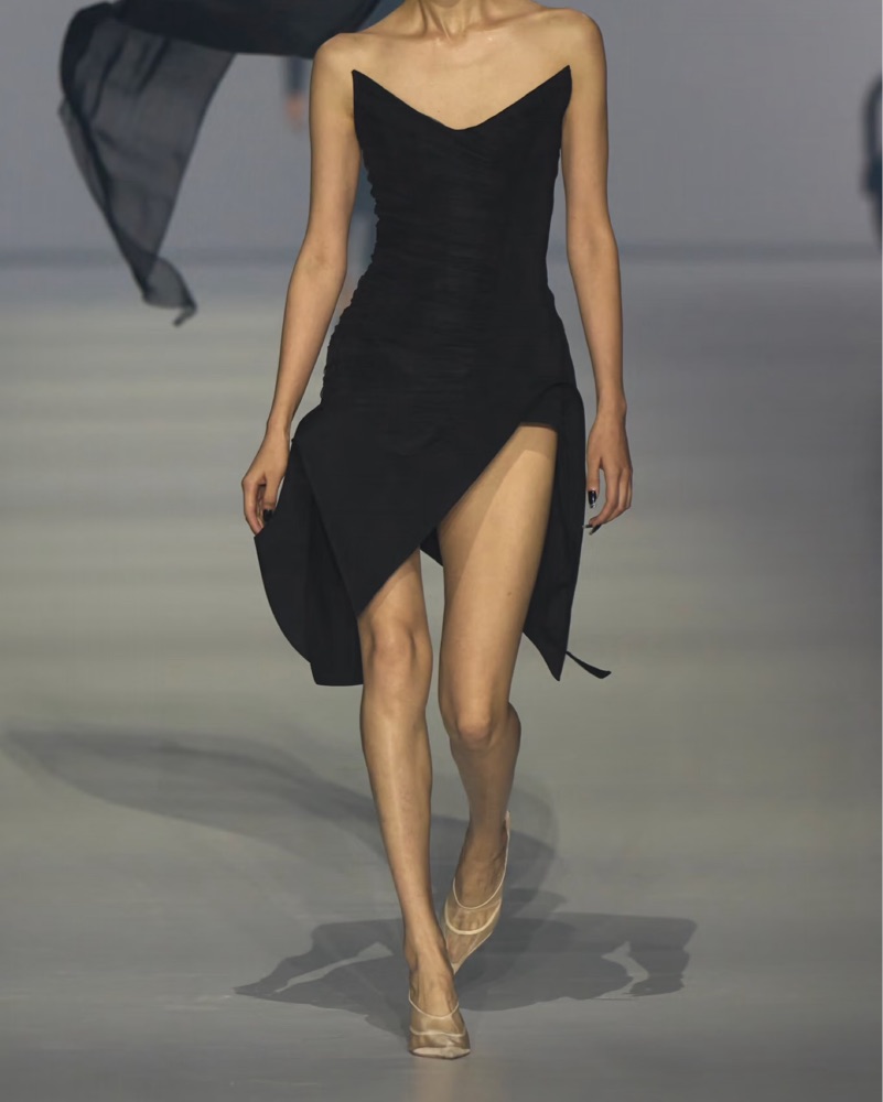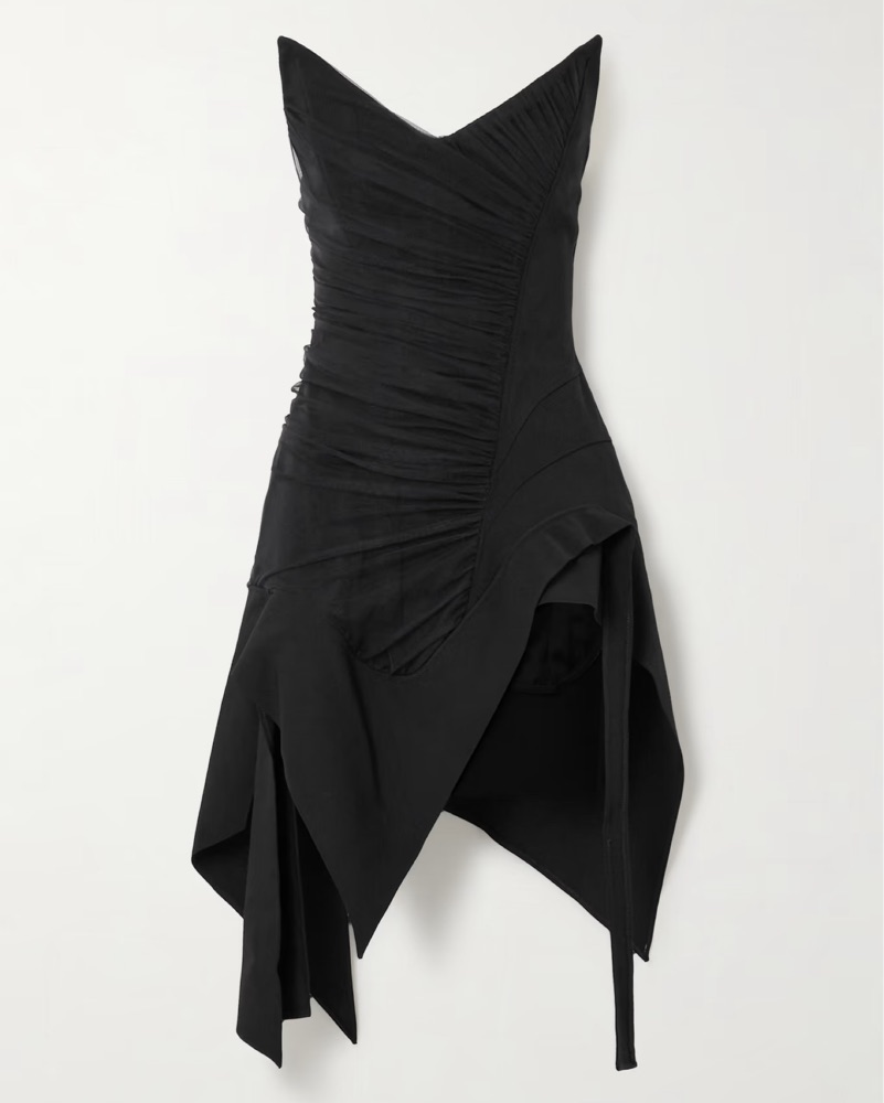 Mugler strapless asymmetric ruched tulle-paneled crepe dress. The perfect LBD 🖤🖤. In new condition. It is a size FR 38 and fits a U.S. 6