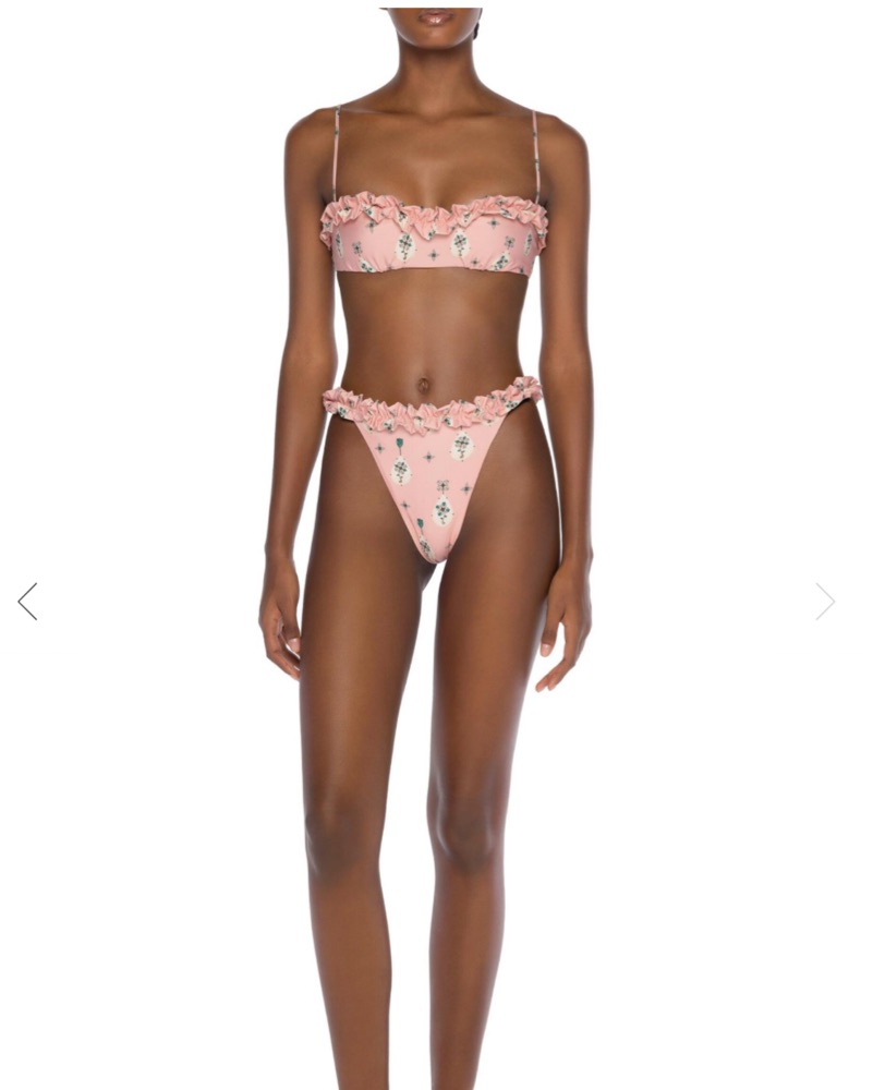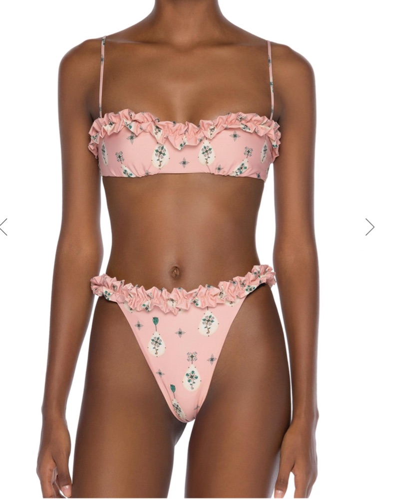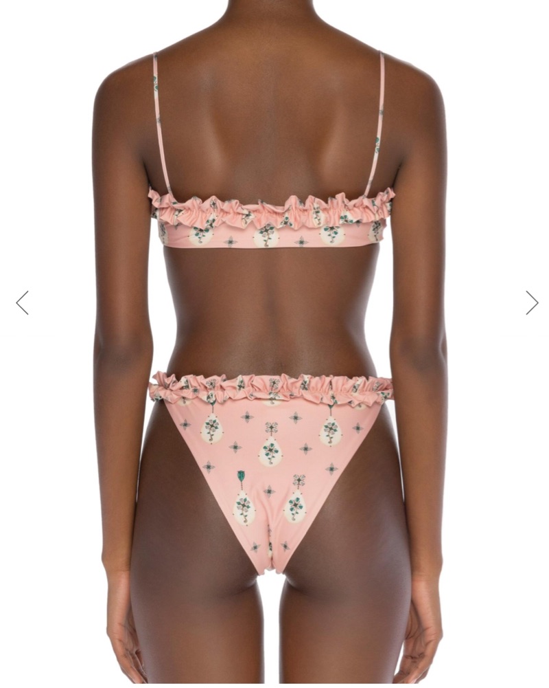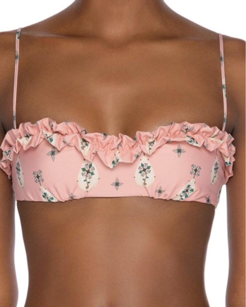 This delightful bikini top features a playful floral print and ruffled detailing, perfect for a sunny beach getaway or poolside lounging. Style name: Alma Agatha Joyeria Ruffled Bikini Top. Matching bottom sold separately in size M.