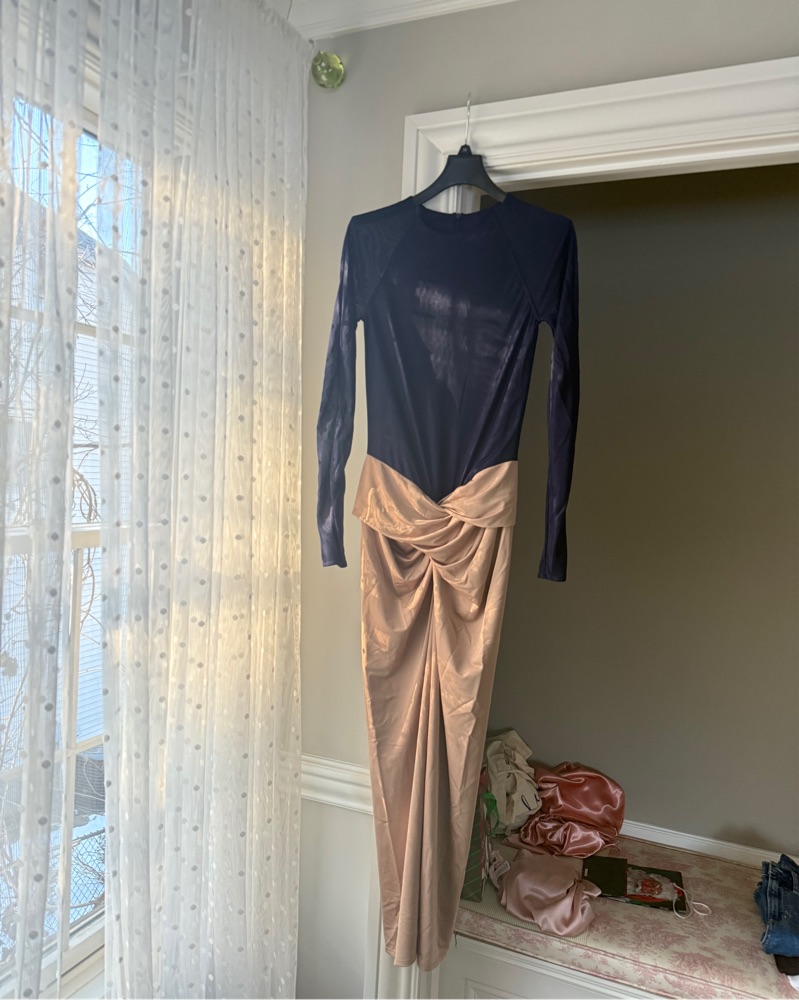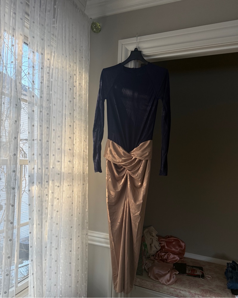 This sophisticated satin dress features a flattering wrap silhouette, perfect for a formal event or special occasion. UK8, US2