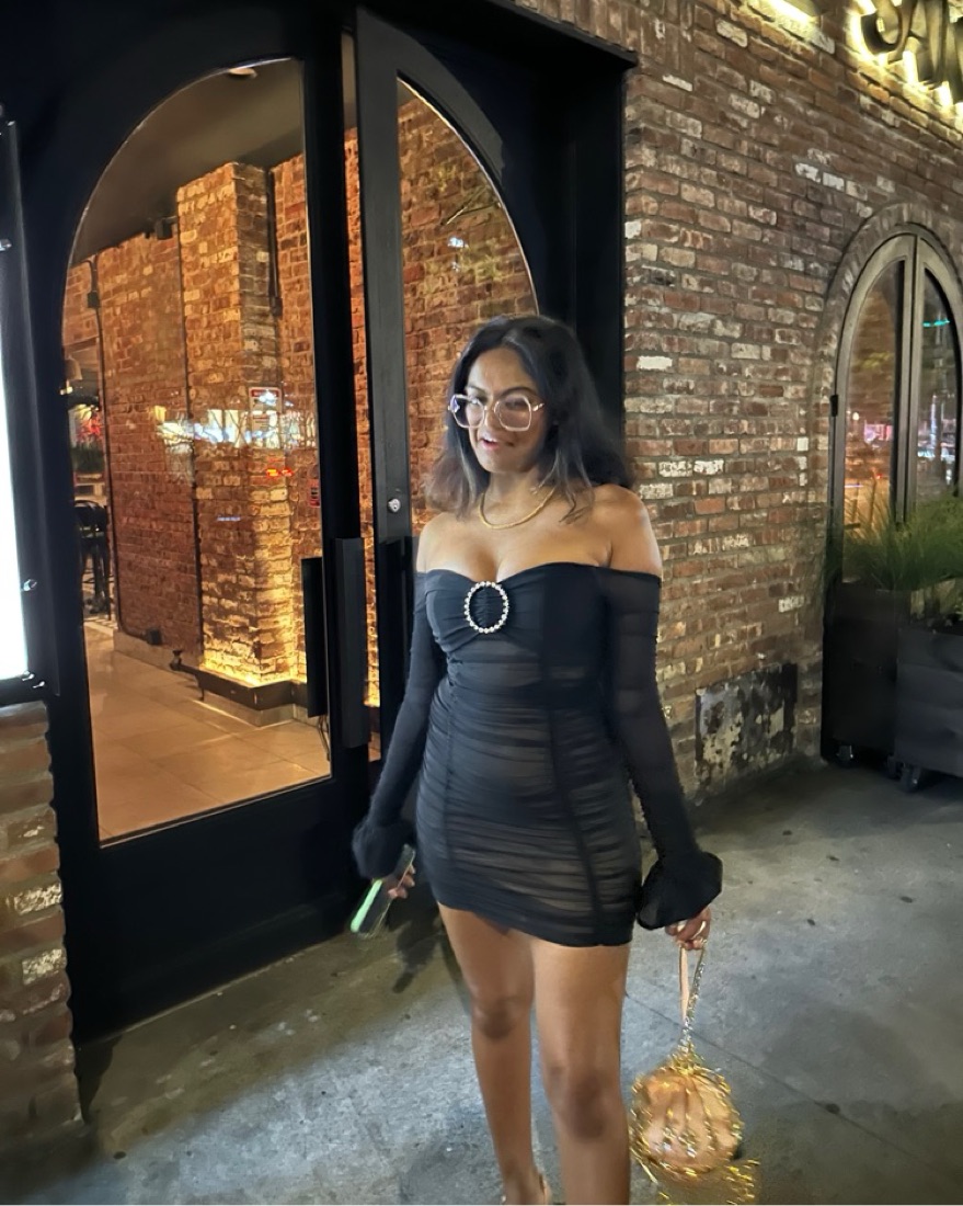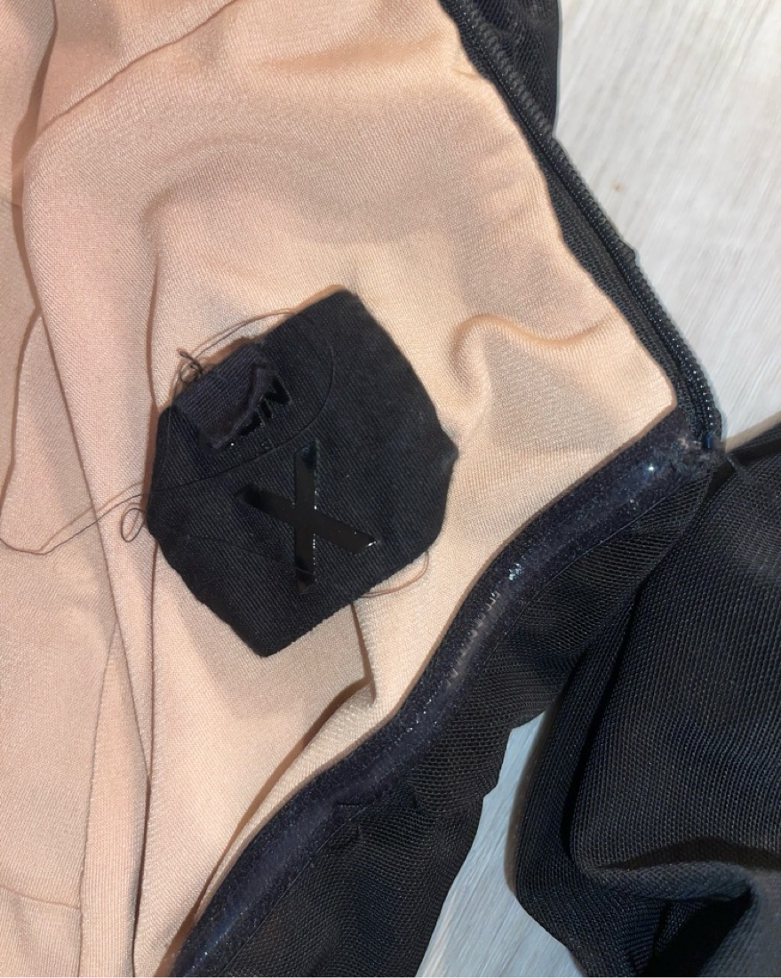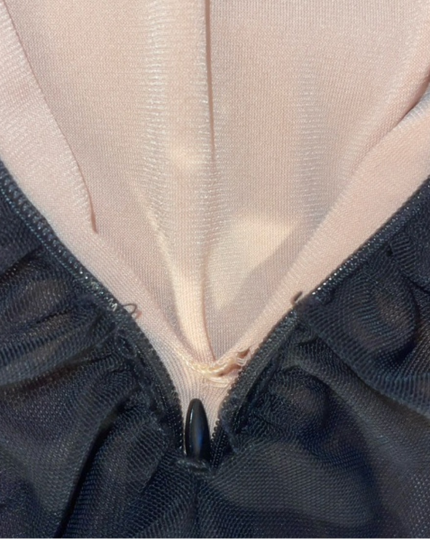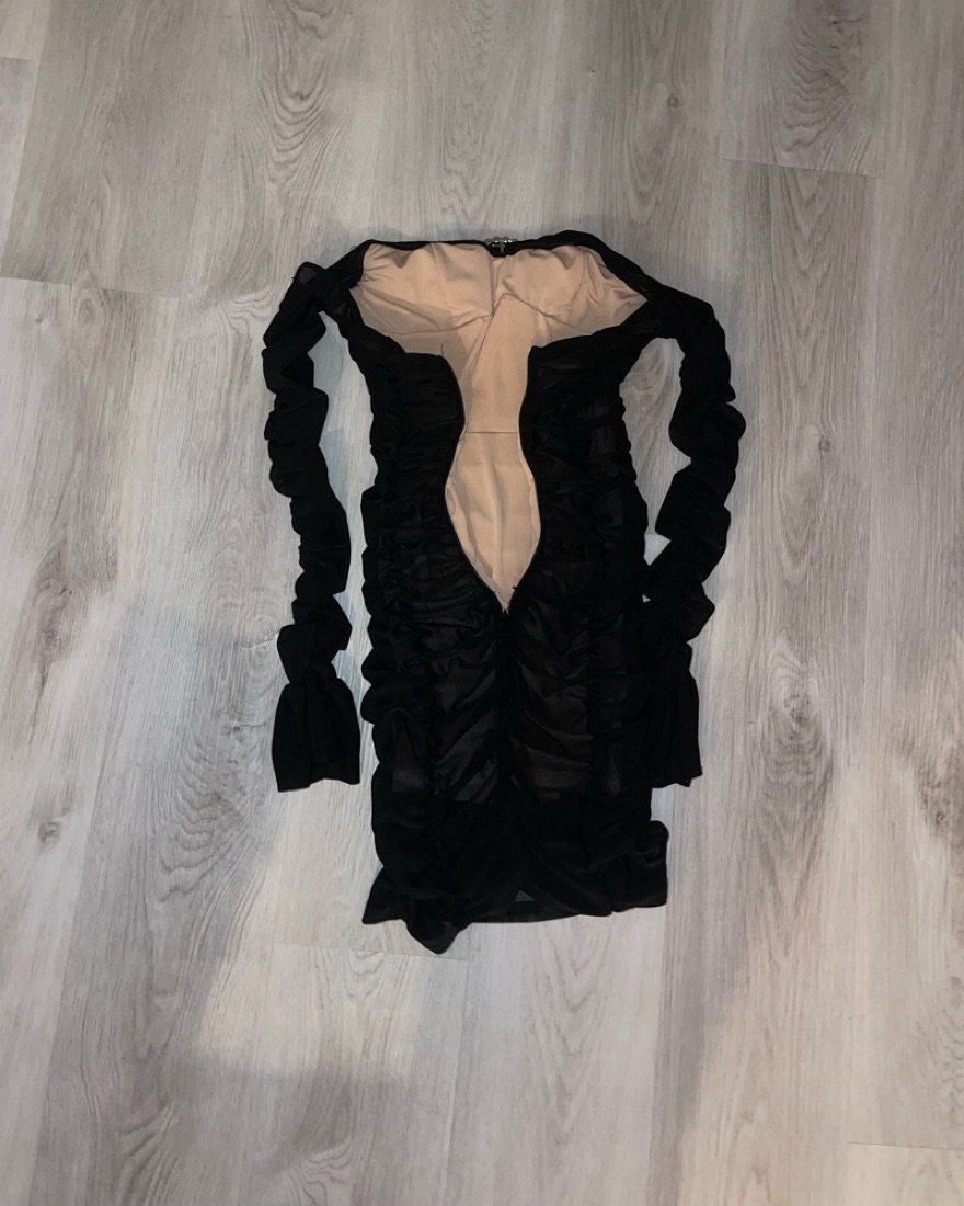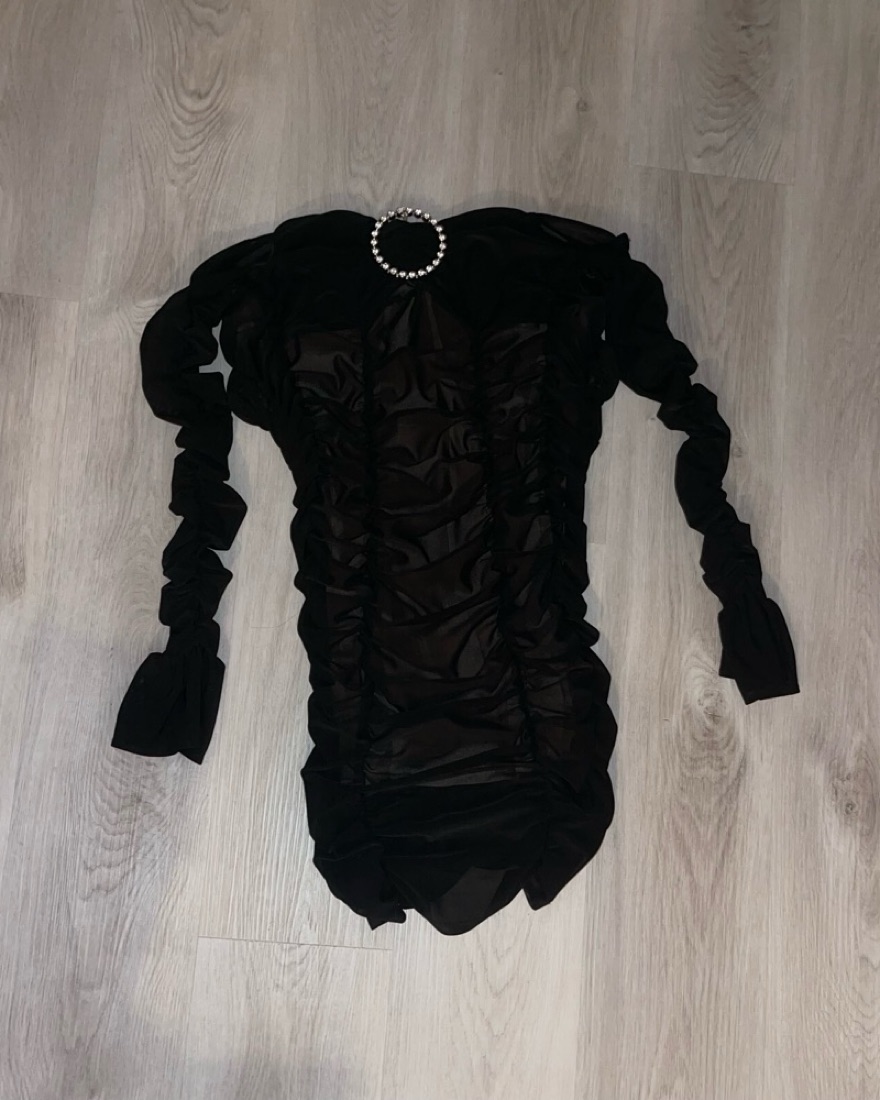 Black Strapless Bodycon Dress with Crystal Brooch; Small Tear of Inner Fabric near Zipper
