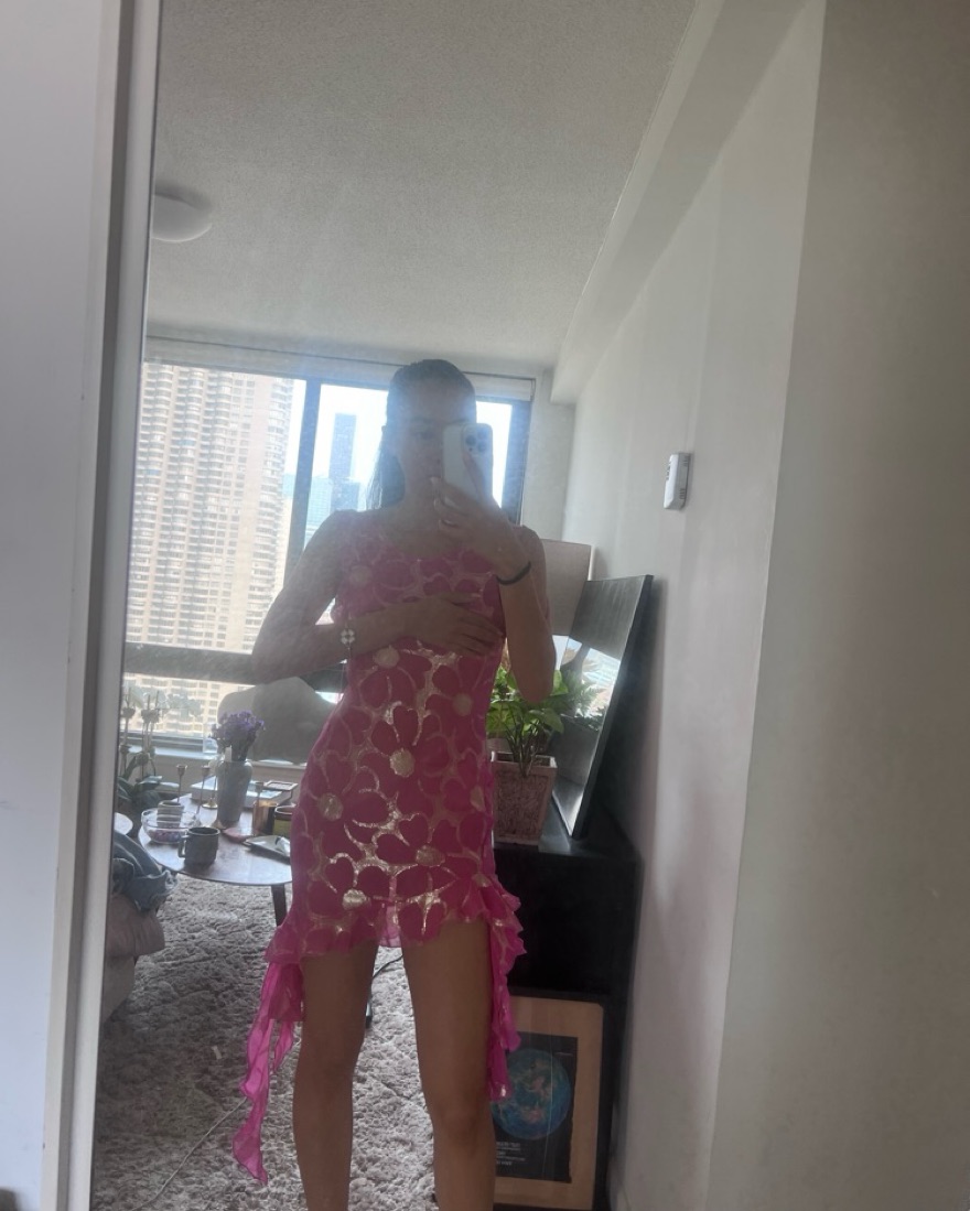 A pink and yellow floral Delfi Collective mini dress!! Wear it as a cover up or a more risque going out moment 🩷 is a medium but fits a small