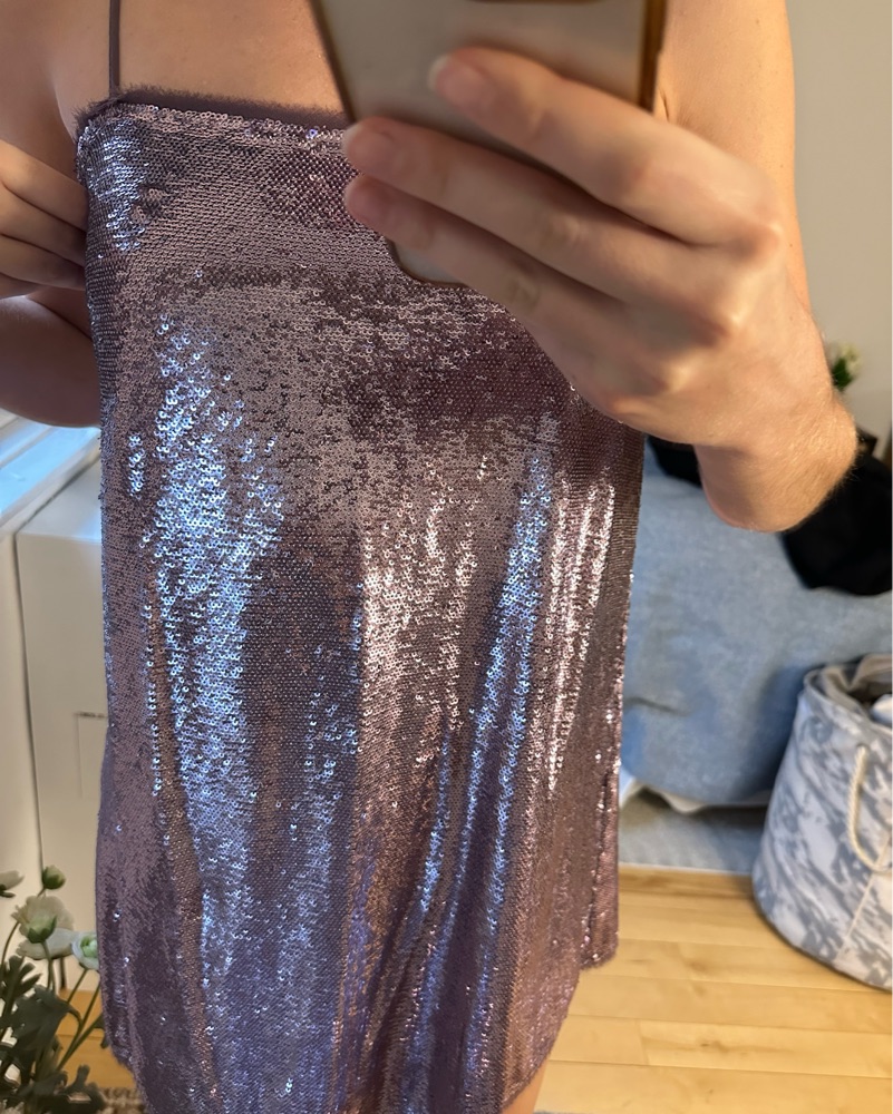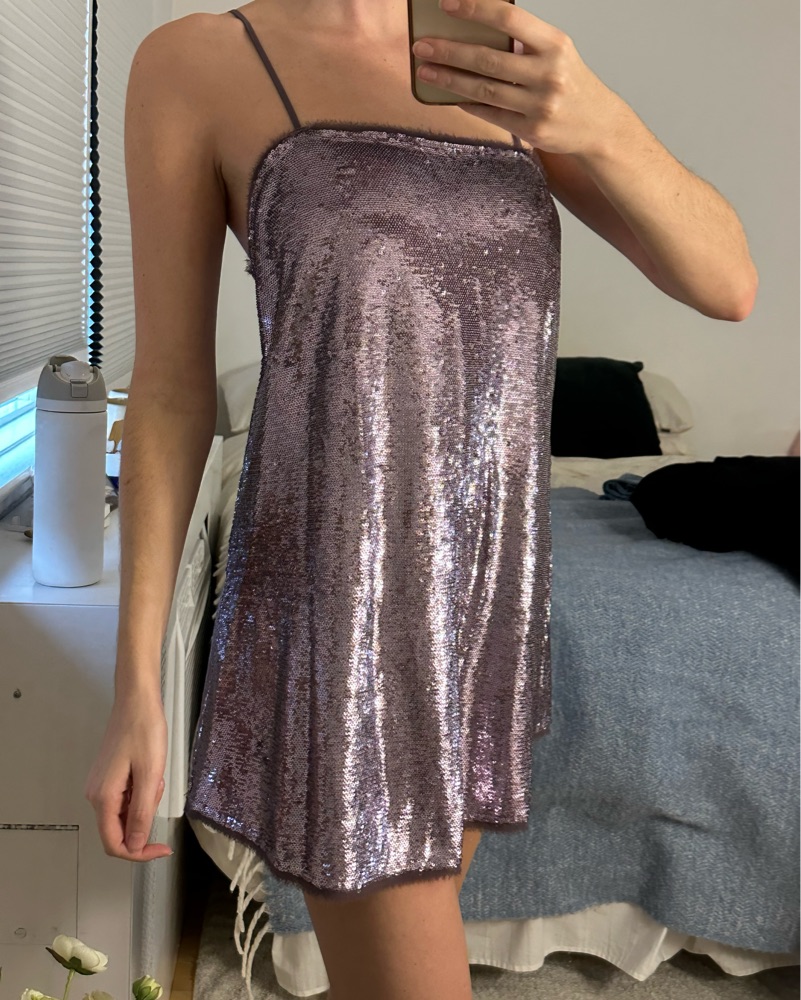 This shimmering slip dress is perfect for a night out on the town. The allover sequins add a touch of glamour, making it a great choice for a party or special event.
