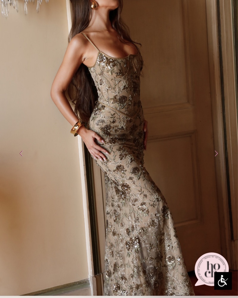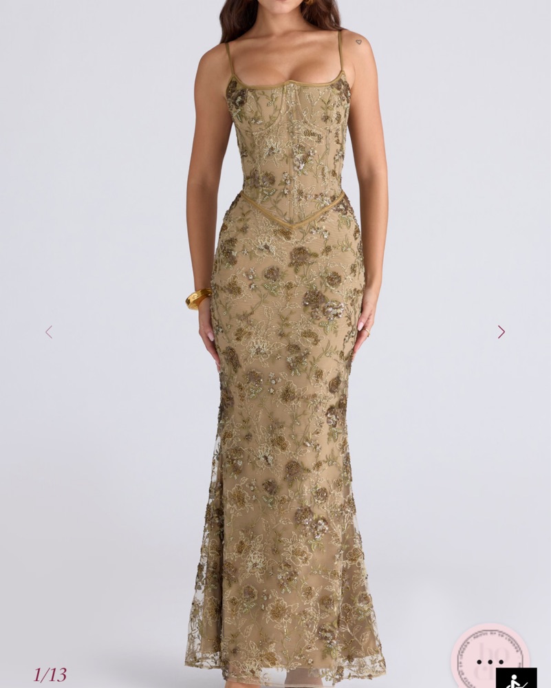 BEAUTIFUL corset naima dress in olive. Great for fall weddings . Sold out - scoured up and down everywhere to get my hands on it lol . The item is hemmed one inch shorter to prevent dragging on ground/ damage to the sensitive fishnet material.