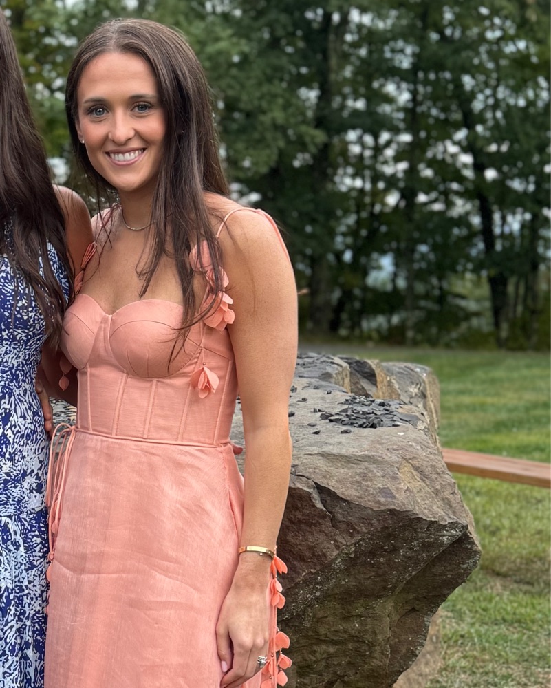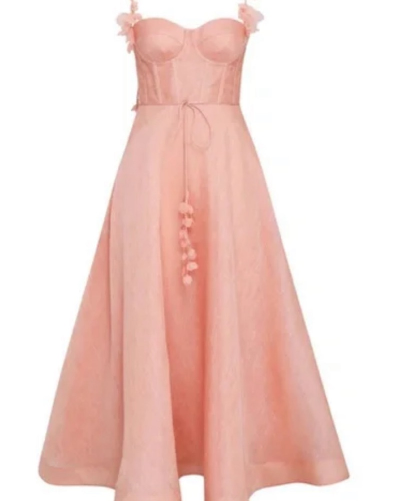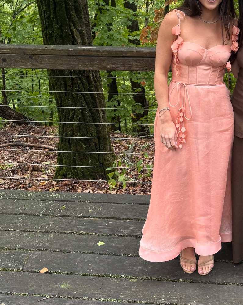This elegant blush pink maxi dress features a figure-flattering bustier-style bodice with delicate ruffled details. It's perfect for a formal event, such as a wedding or gala.