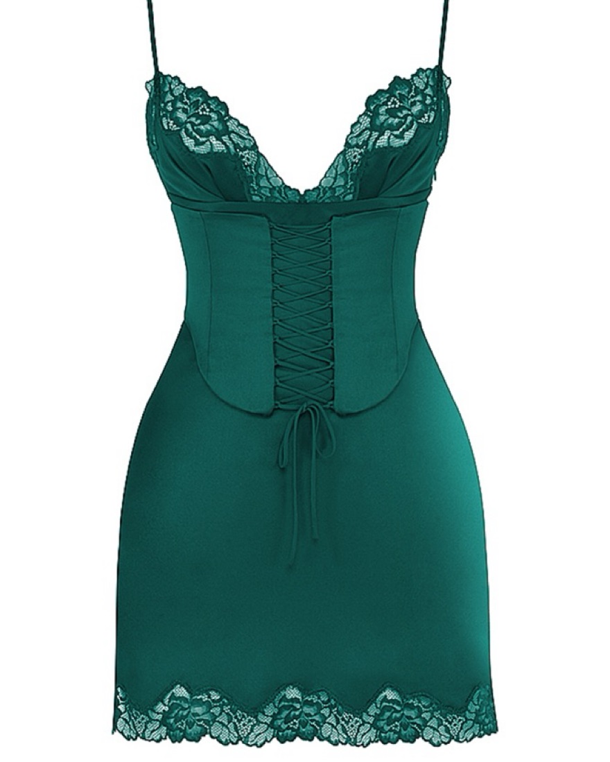 Soraya forest green color, satin slip dress with detachable corset. True XS, fits 23-25.5 waist size.