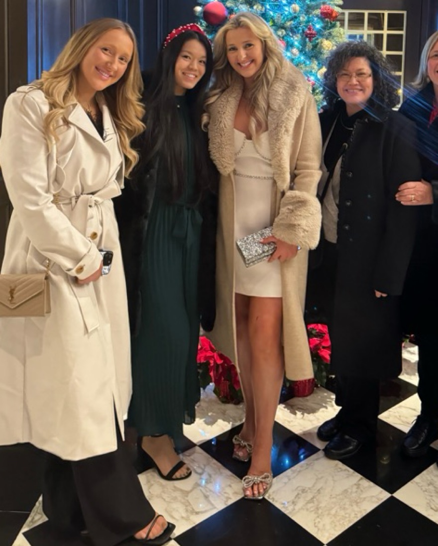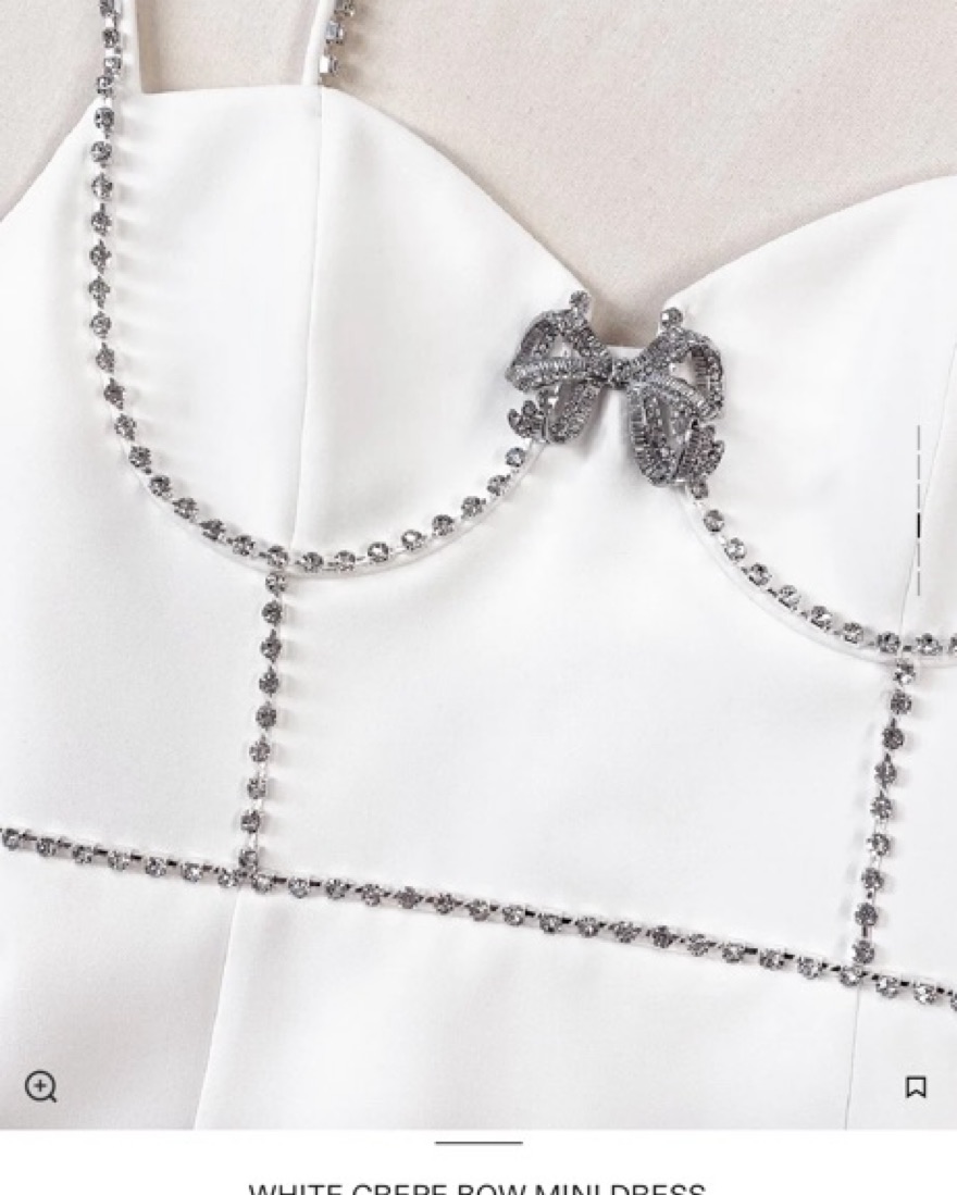 Self-Portrait's crepe minidress is punctuated with a crystal-encrusted bow at the chest that matches the embellished spaghetti straps, bust and waist.