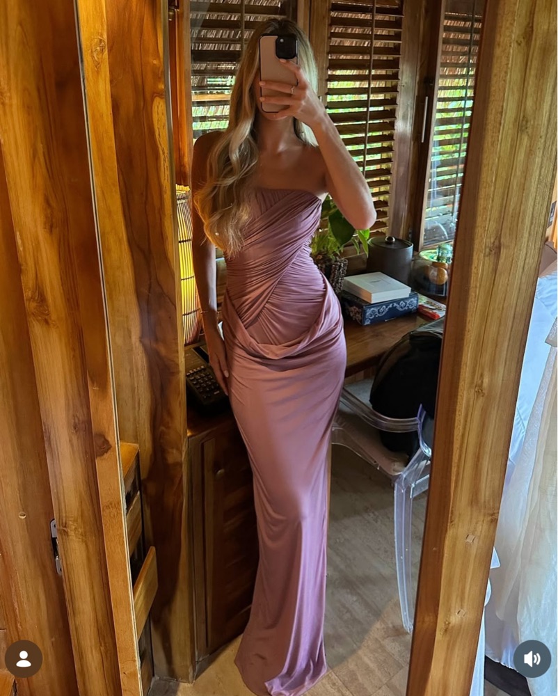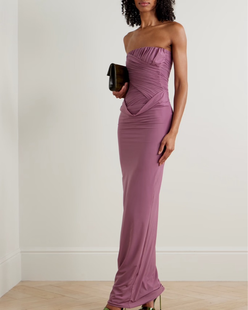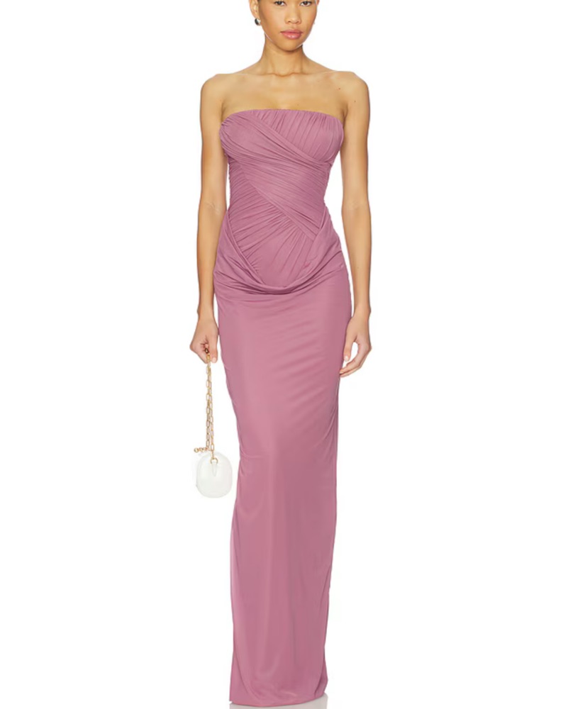 Made from stretch-jersey, it's crisscrossed through the bodice and draped at the waist. Fits true to size, however those who are between sizes should take the larger size. Dress is a “S/M” on tag, but I personally think it fits more like a small