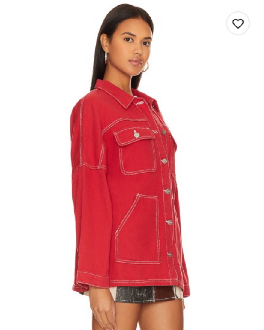 A bold and stylish denim jacket in a vivid red hue. Perfect for adding a pop of color to any outfit.