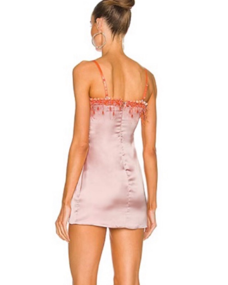 This playful, party-ready slip dress features a delicate feather trim that adds a touch of whimsy. Perfect for a night out or special occasion.