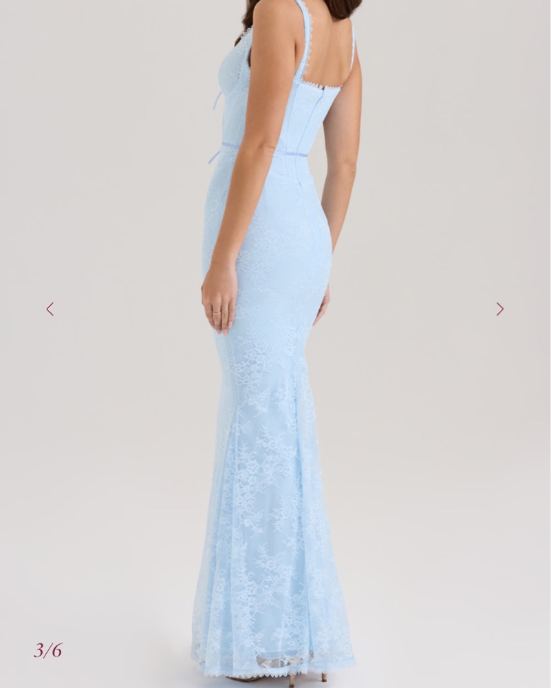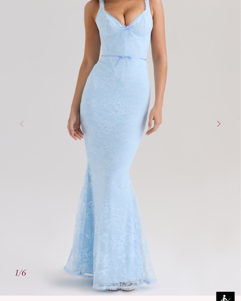 SARAI Blue Lace Godet Maxi Dress. This stunning lace mermaid gown is perfect for a formal occasion. The delicate lace details and figure-flattering silhouette create an elegant and sophisticated look. Super comfy and it snatches you in
