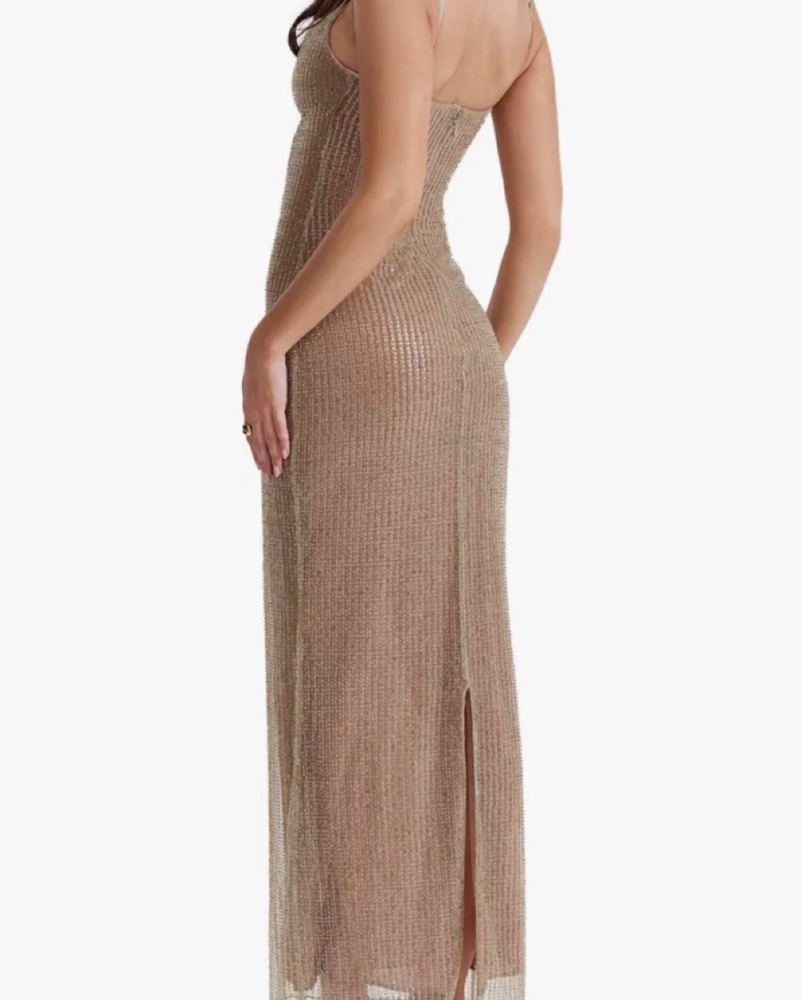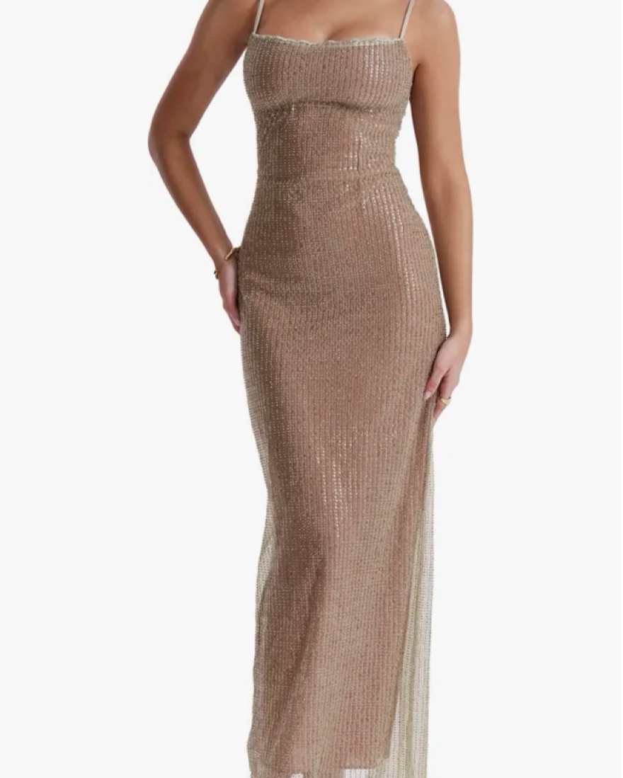 The house of cb Alondra dress!! Its like an olive gold color and so flattering— fits like a glove. Perfect for new years! #houseofcb #skims #sequin #NYE #newyears