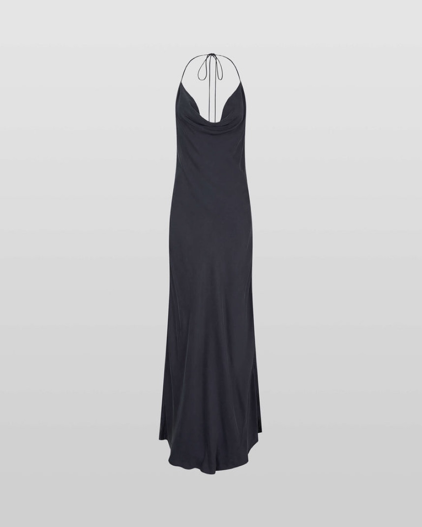 In deepest navy, cowl neck, super low back, figure skimming, floor-sweeping silhouette - take on Figure skimming, floor-sweeping silhouette. Twist on the 90s favourite slip.