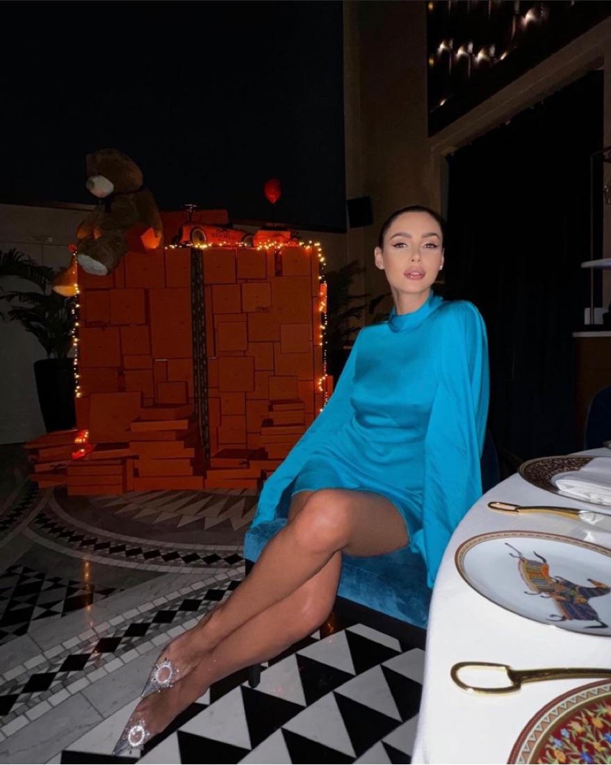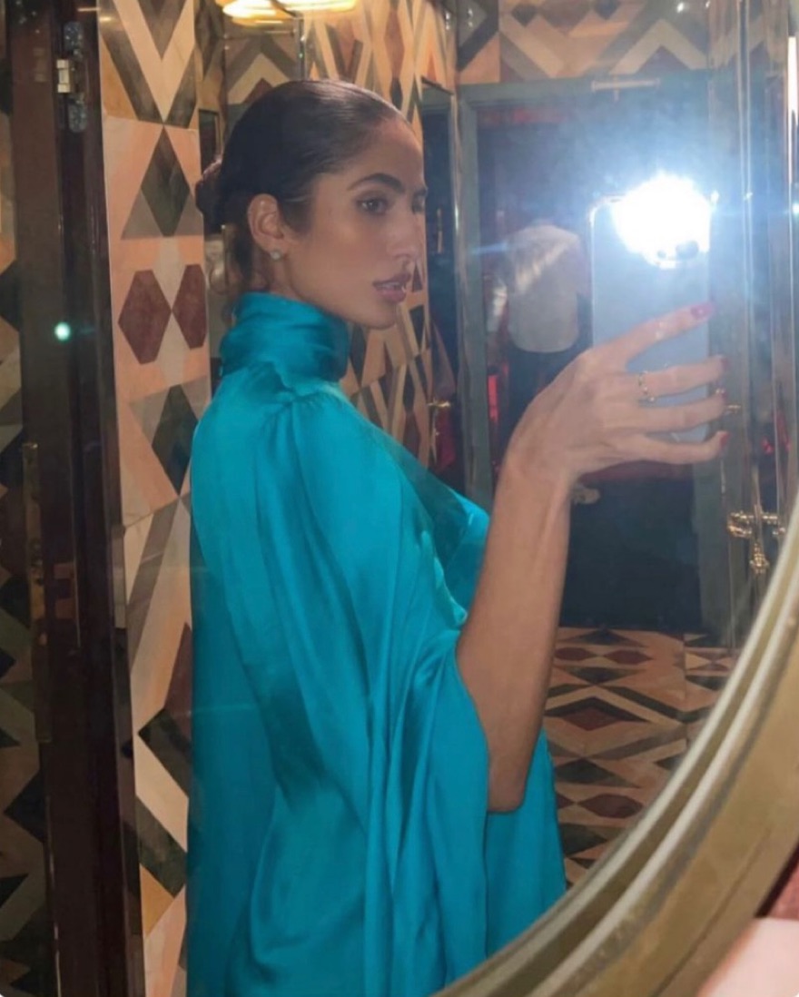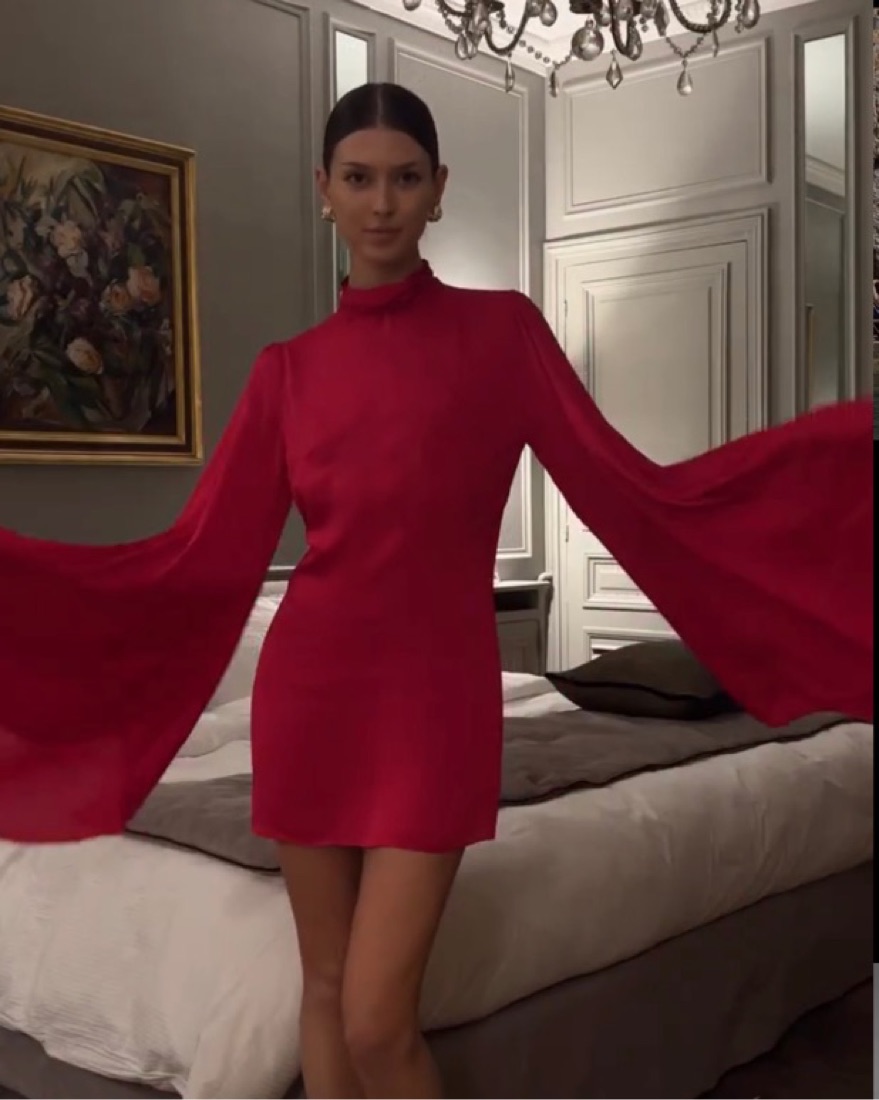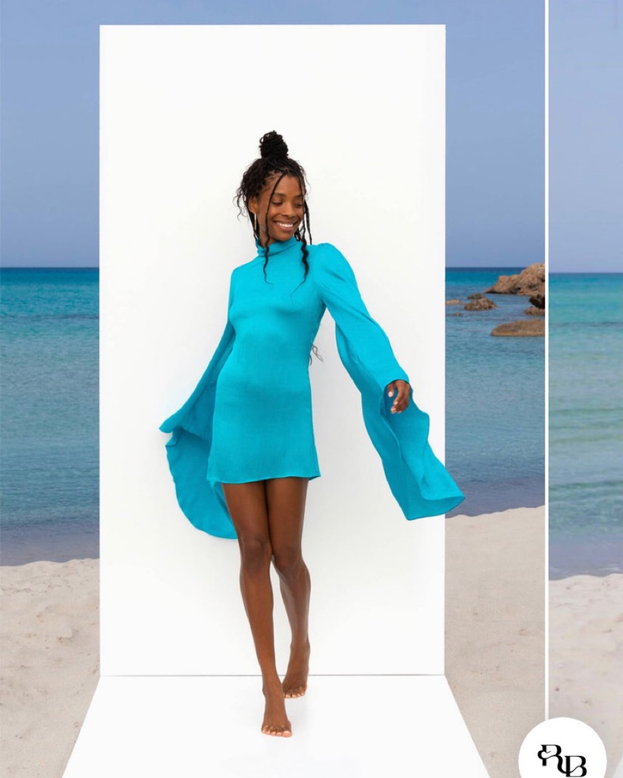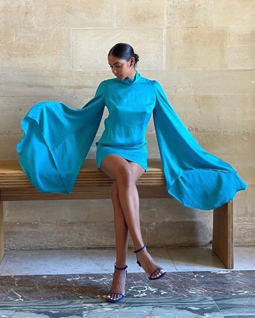 Crafted from luxe, figure-skimming satin in a sophisticated shade of blue and cut to a strong, dramatic silhouette, it has an elegantly high neck and extra long, exaggerated cuffs that enhance the fluidity of this style.