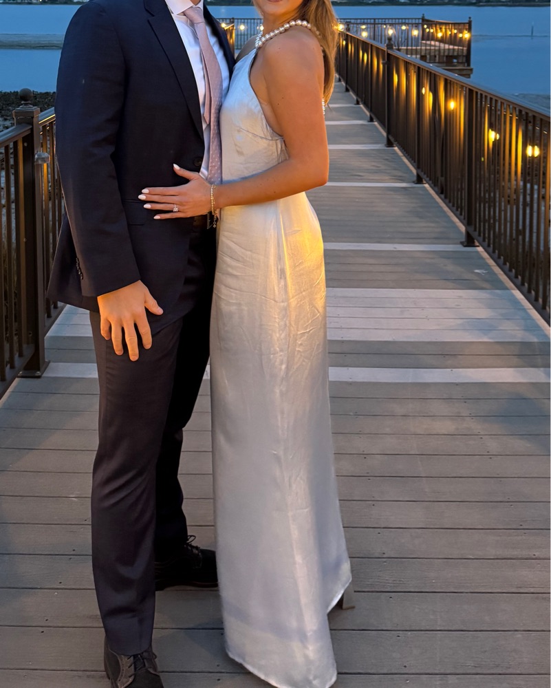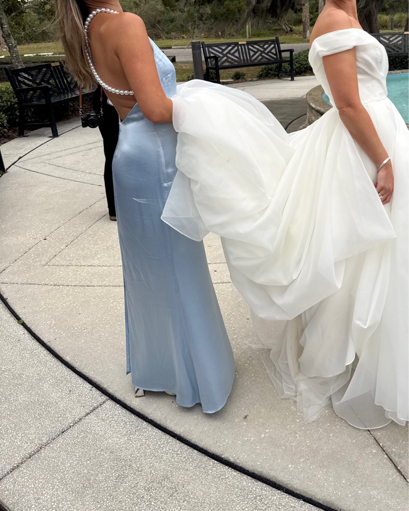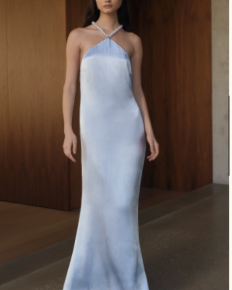 Blue pearl halter dress from Meshki — perfect as a wedding guest or bridesmaid.