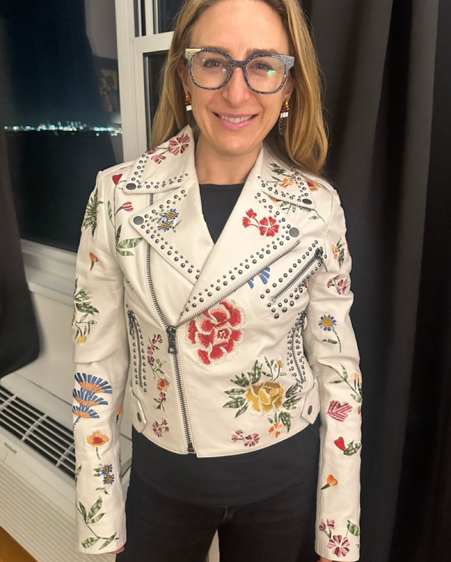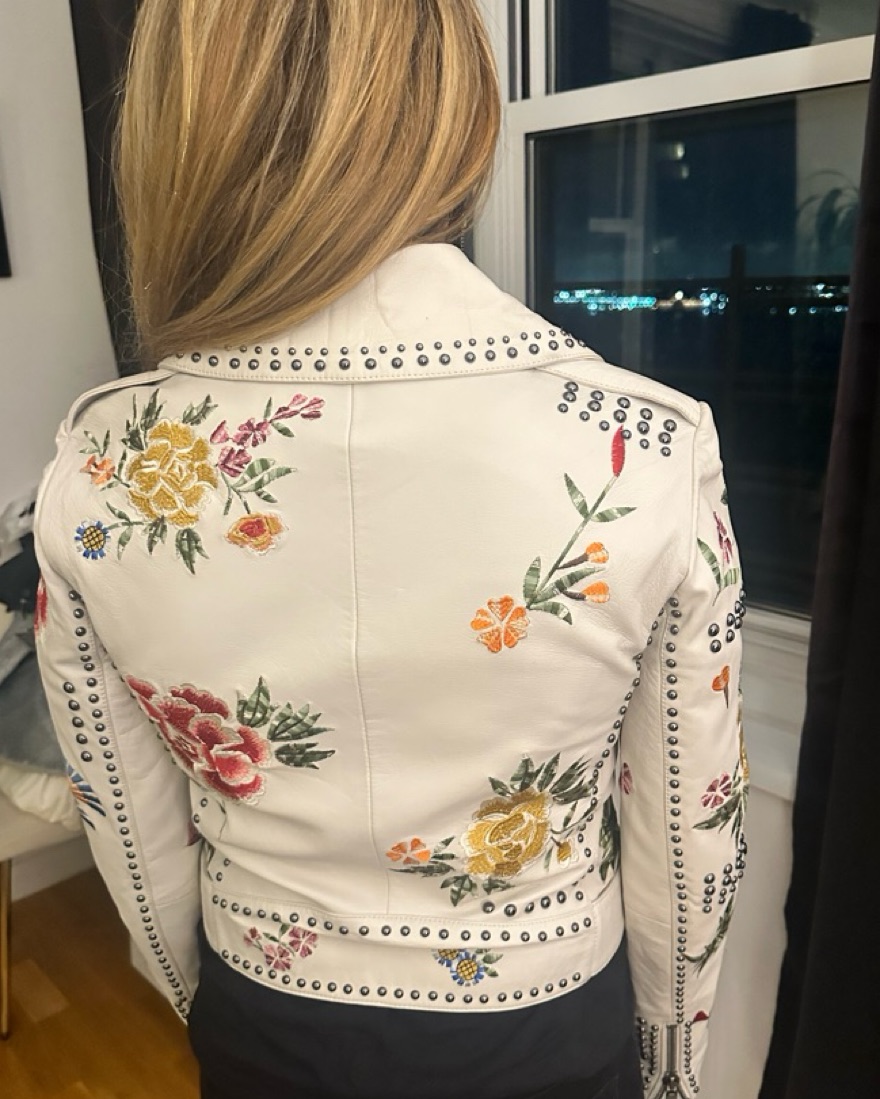 Alice + Olivia White Cody Leather Jacket with embroidered floral detail and metal studs. Has all biker jacket details including zippers on sleeves. Size Small.