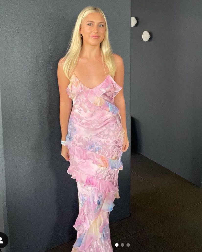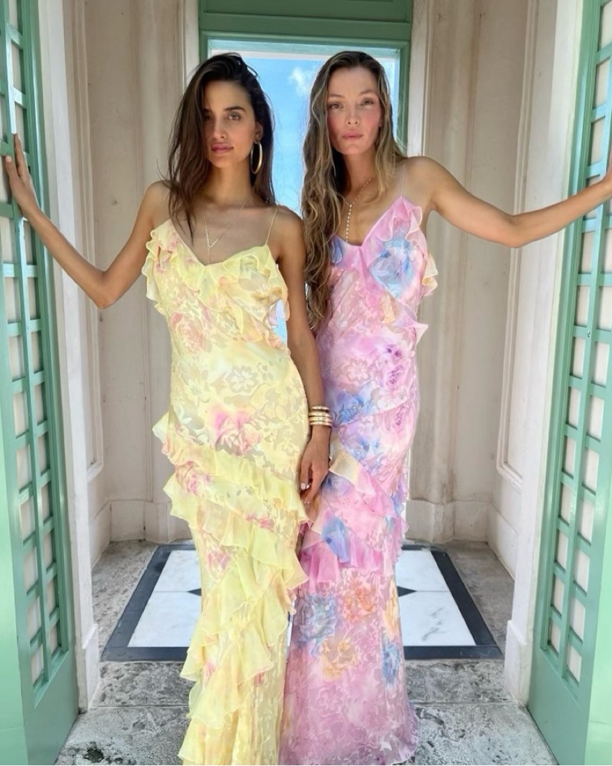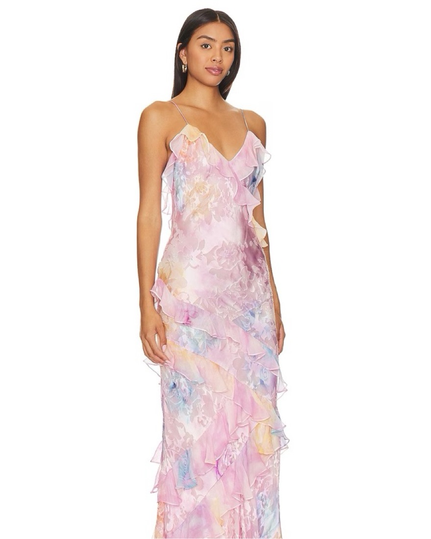 Brand new & sold out everywhere!!! The prettiest ruffle slip gown in sunset hues of pink, blue and orange. Silk chiffon fabric with burnout floral pattern and cascading asymmetrical ruffles through the fitted skirt. Low back and fine delicate straps add to the super pretty, feminine feel.