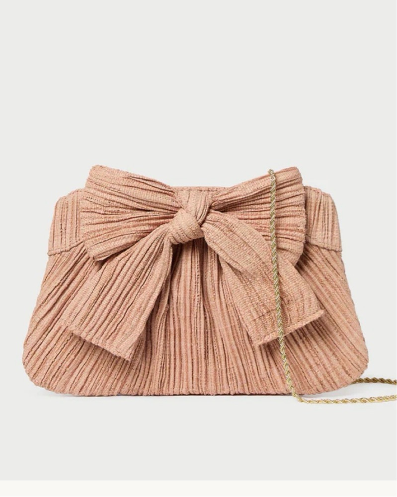 Pleated frame clutch in blush woven straw topped with our signature knotted bow. Features a removable twisted gold chain crossbody strap, frame closure, full lining, and an exterior gold stamped logo.