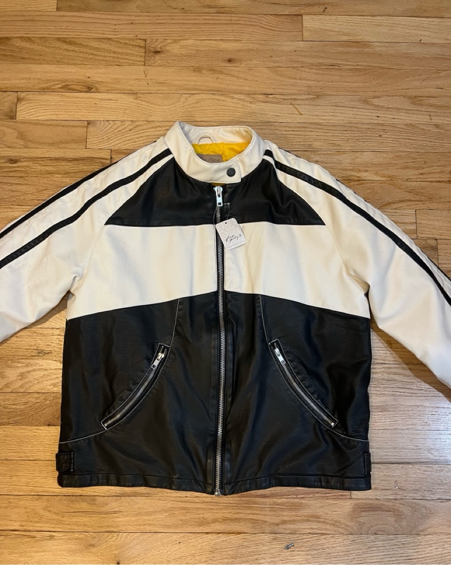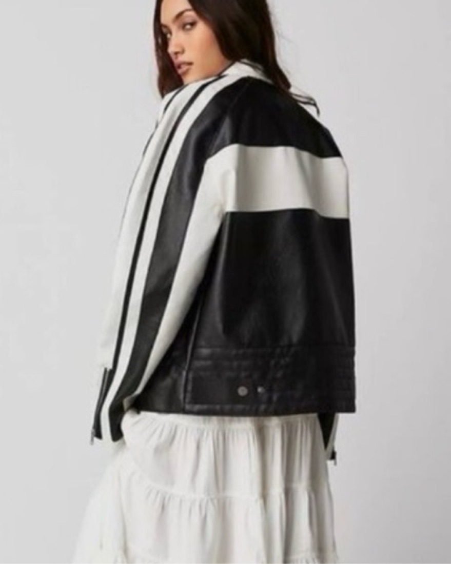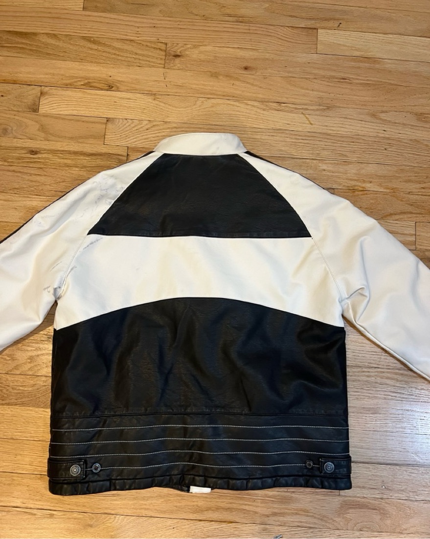 Black and white moto jacket with tags never worn but has a few black stains from being placed next to another black jacket. Selling at a discount