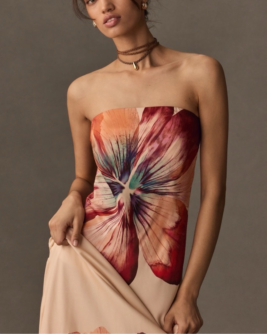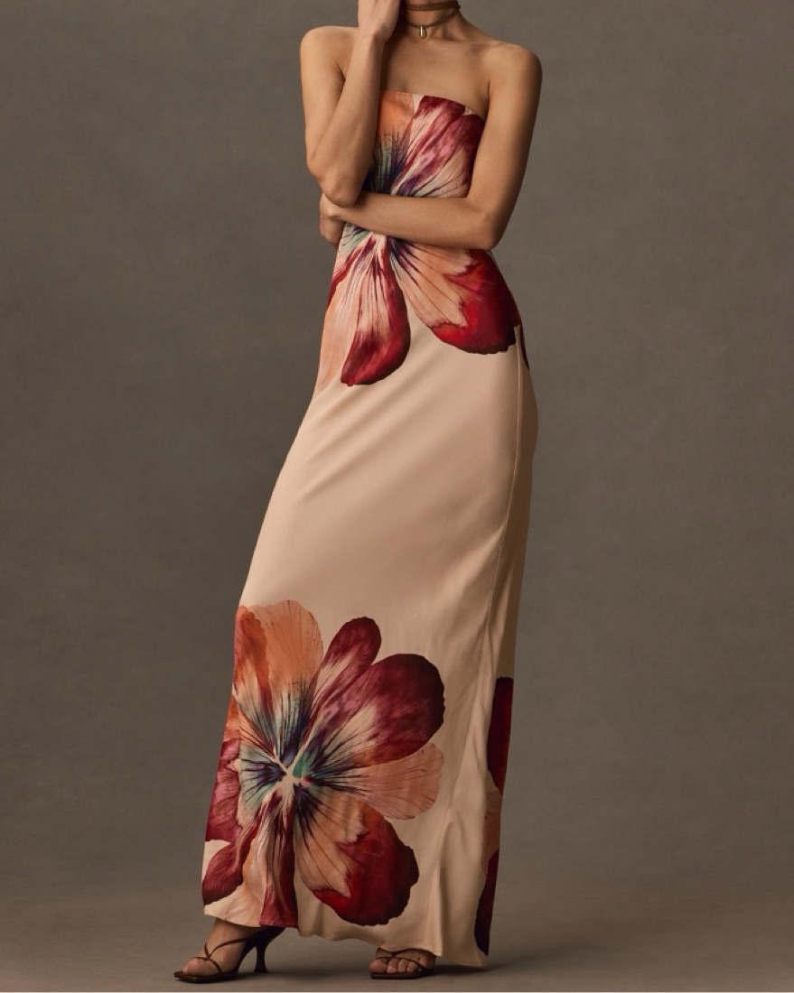 The Fleur Strapless Satin Maxi Dress by Anthropologie - Pickle