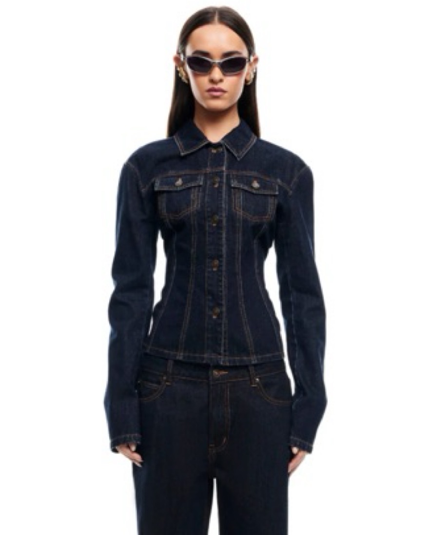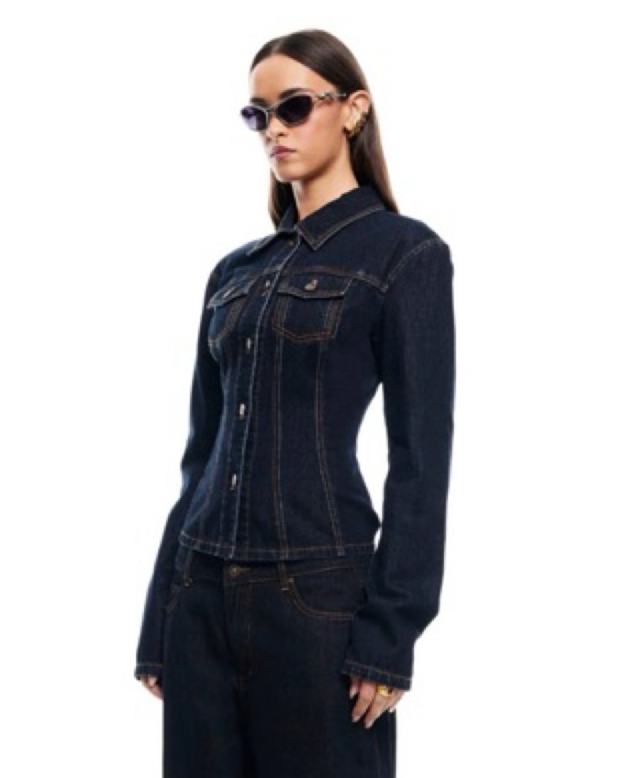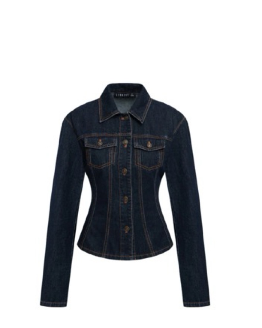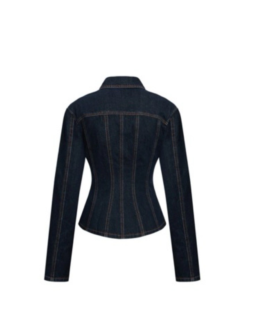 Dark denim jacket. Fit and flare. Goes well with a mini skirt or a matching denim jeans. Any spots/ stains will be charged extra