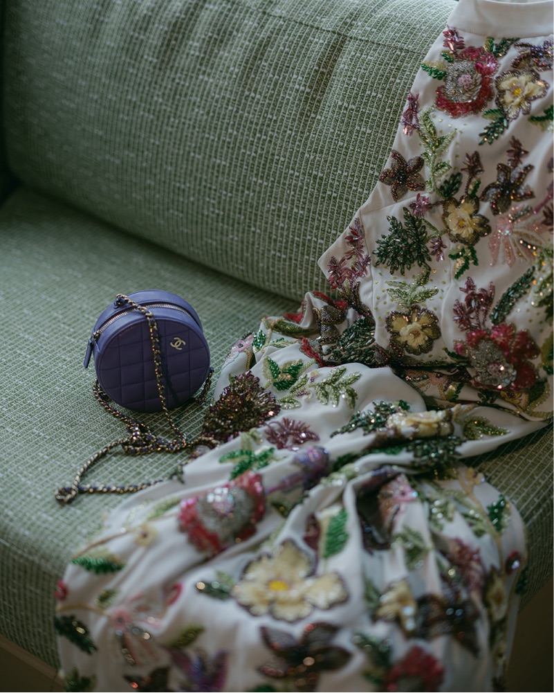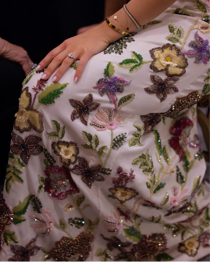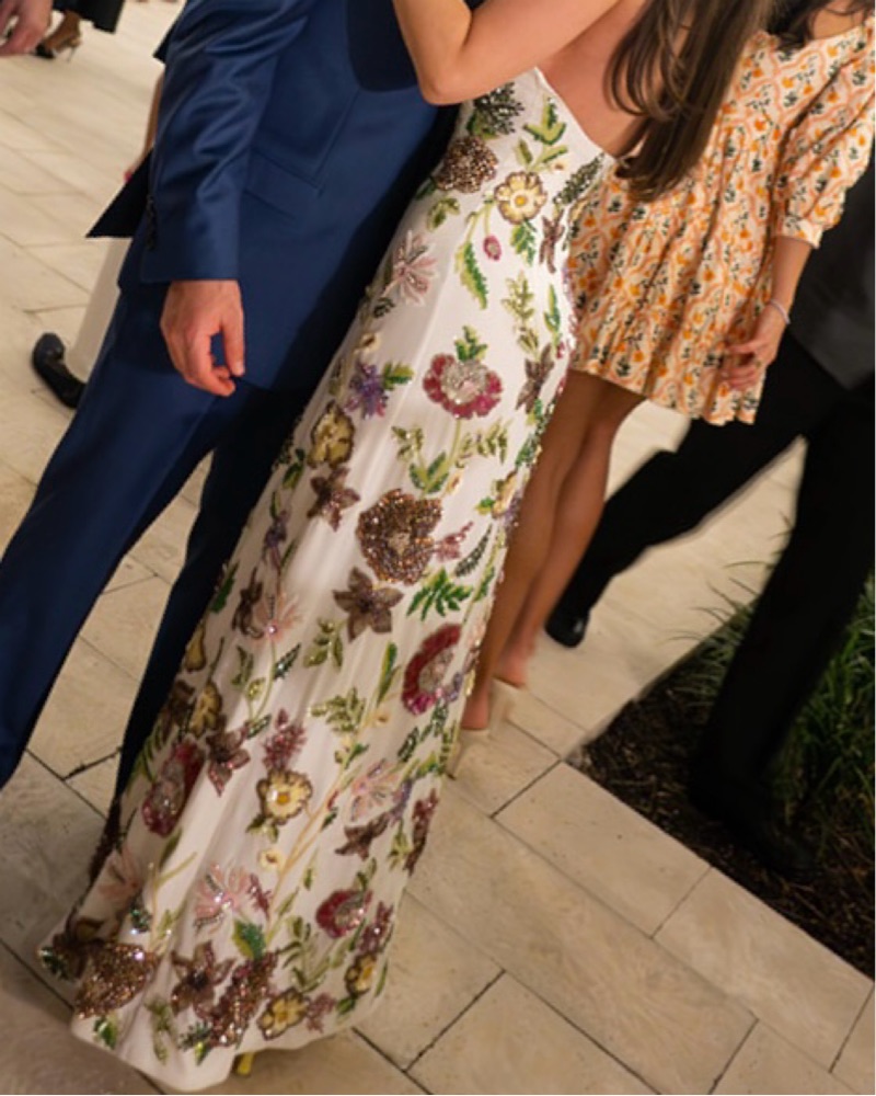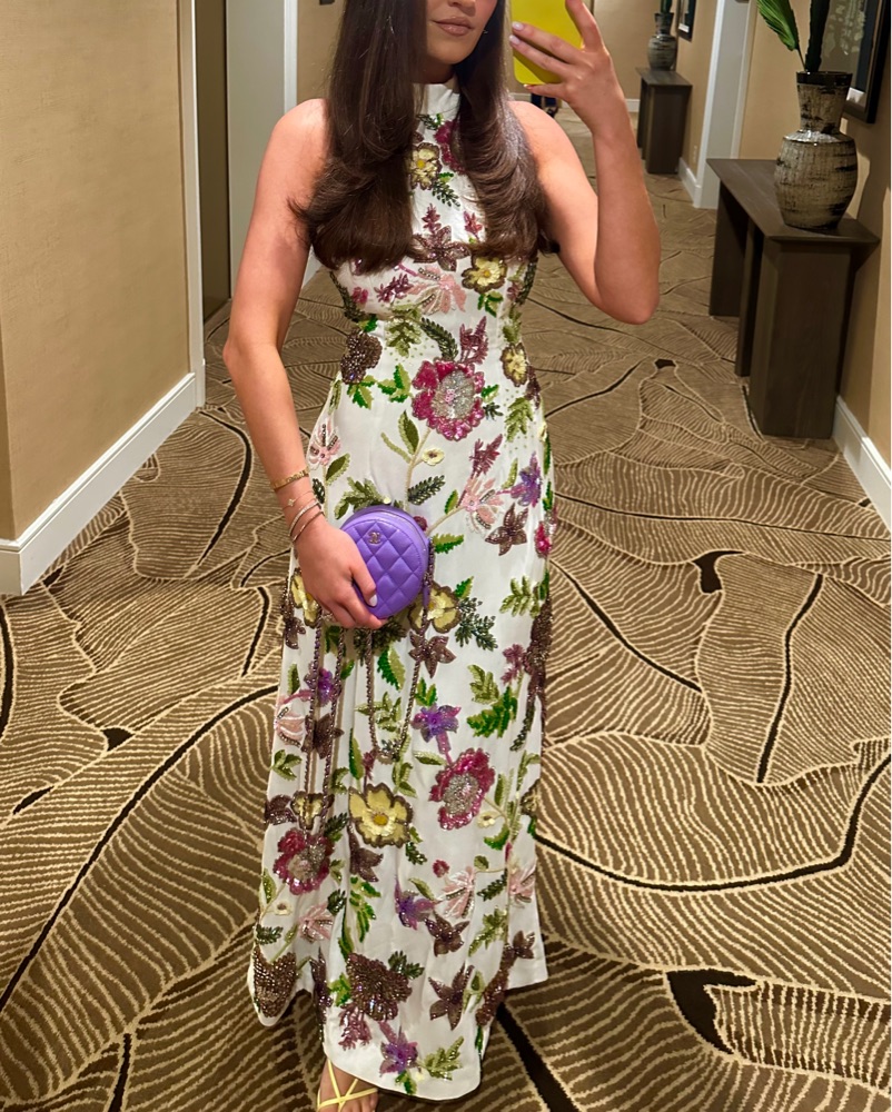 Multicolor floral embellished halter gown with white ground. I had this created for my rehearsal dinner and it’s so good! I wear a size zero and I’m 5’5”