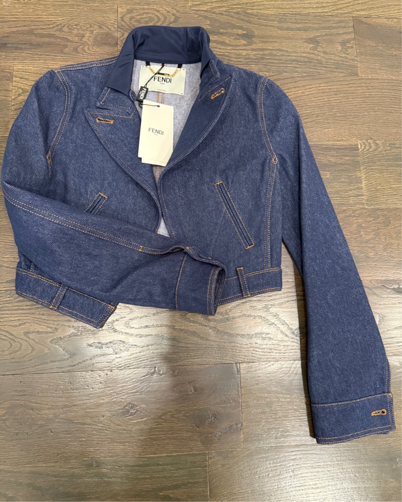 New with tags, never worn. Size 36. Retails for $3500. This Fendi denim jacket offers a modern, chic look perfect for a night out or casual weekend. The cropped silhouette and denim material make it a versatile wardrobe staple.