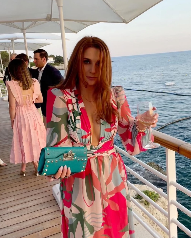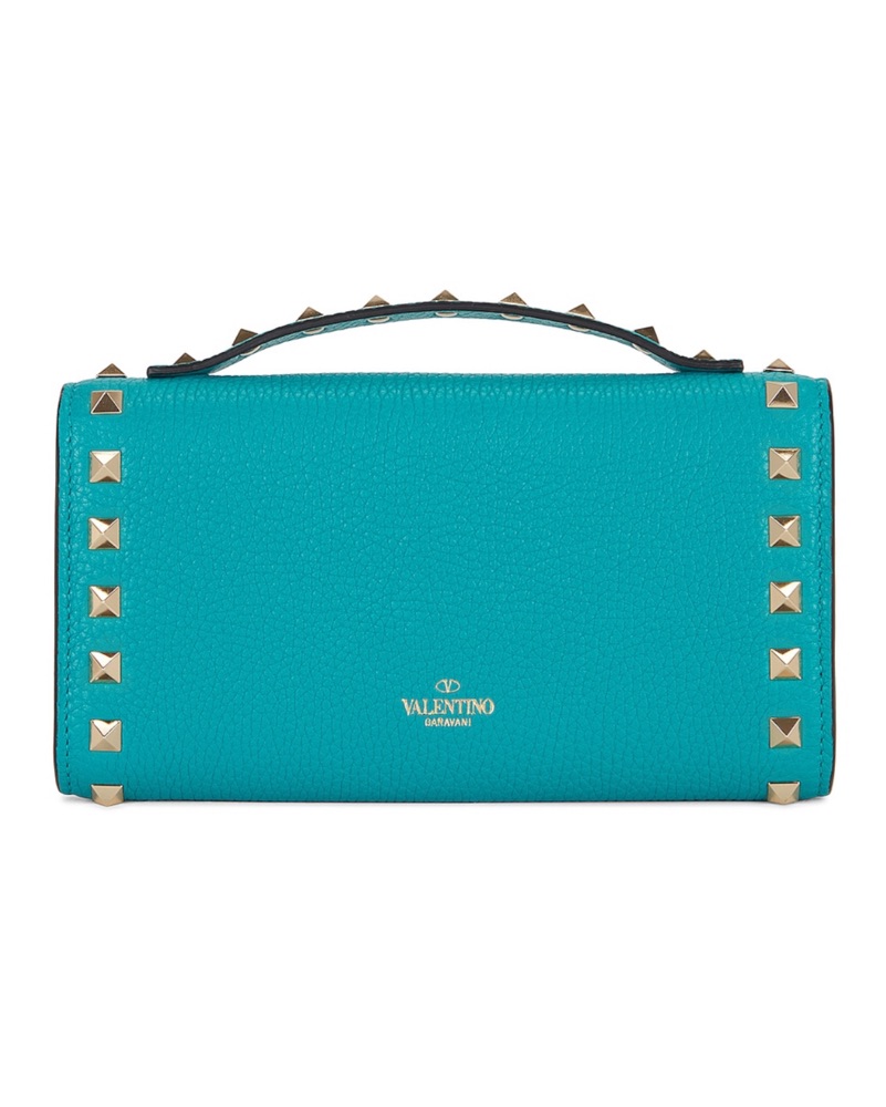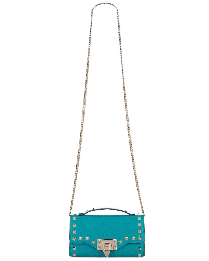 Turquoise leather Valentino bag with signature gold-tone stud detailing. Features a chain strap that allows it to be worn on the shoulder, crossbody, or as a clutch.