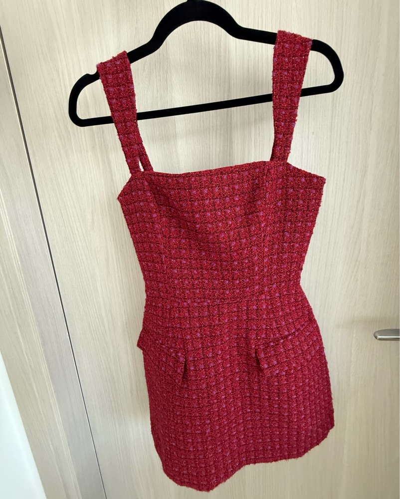 This stunning red tweed dress features a peplum waist for a flattering fit. Pair it with heels for a chic night out.