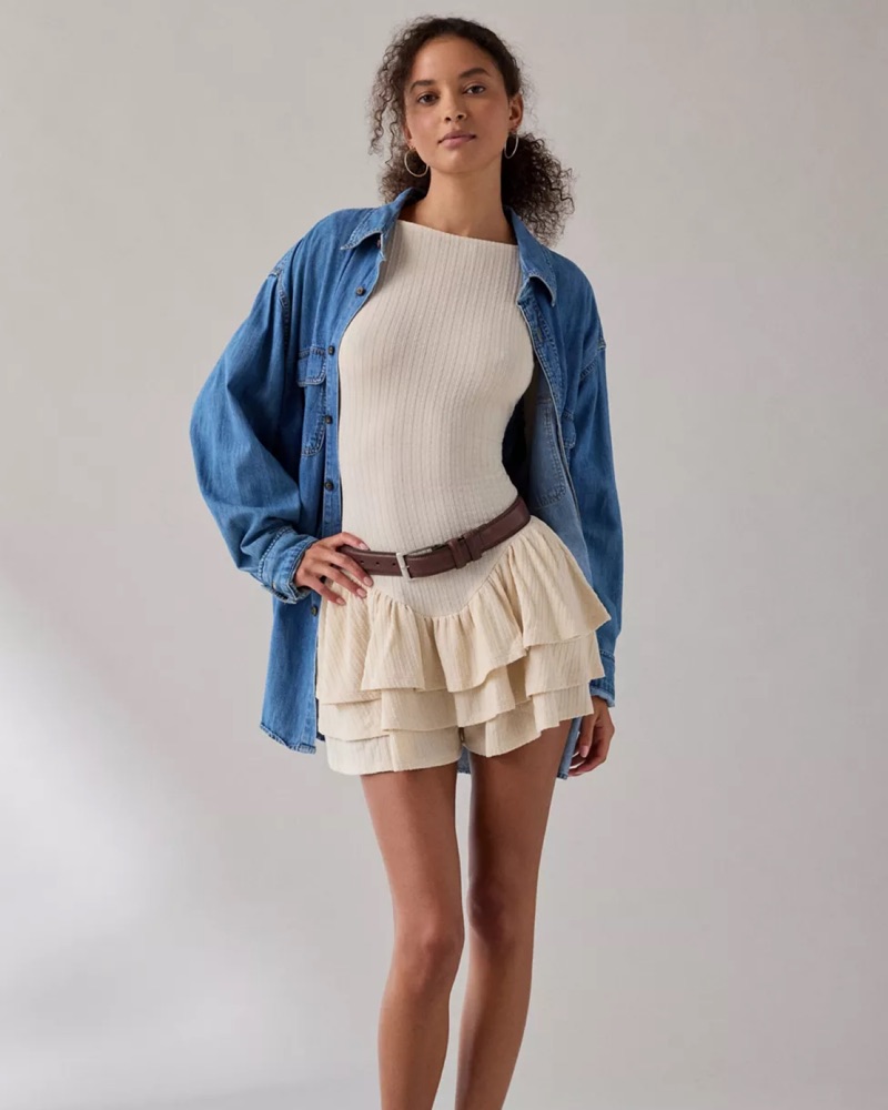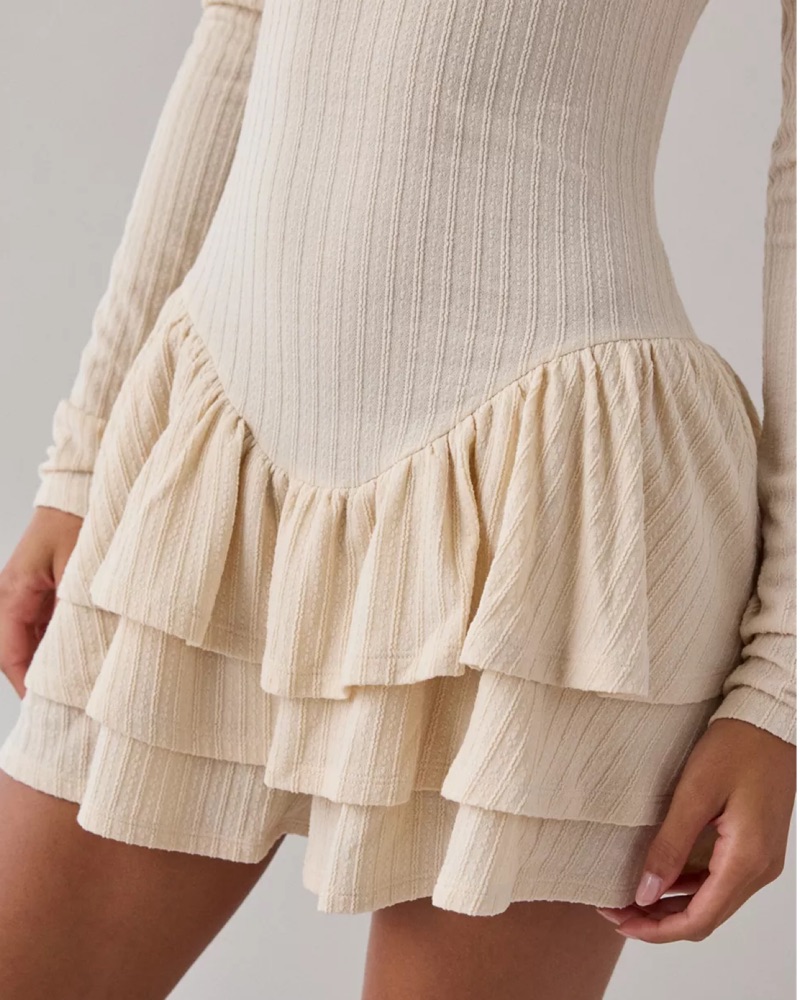 A stylish and feminine ribbed romoernmwith a playful ruffle hem. Perfect for a date night or special event.