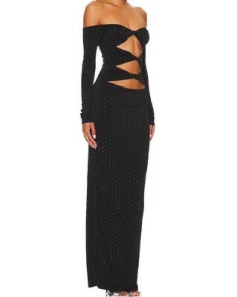 This stunning black off-the-shoulder gown is perfect for a formal event or red carpet affair. The allover sequin embellishments add an opulent, eye-catching touch.