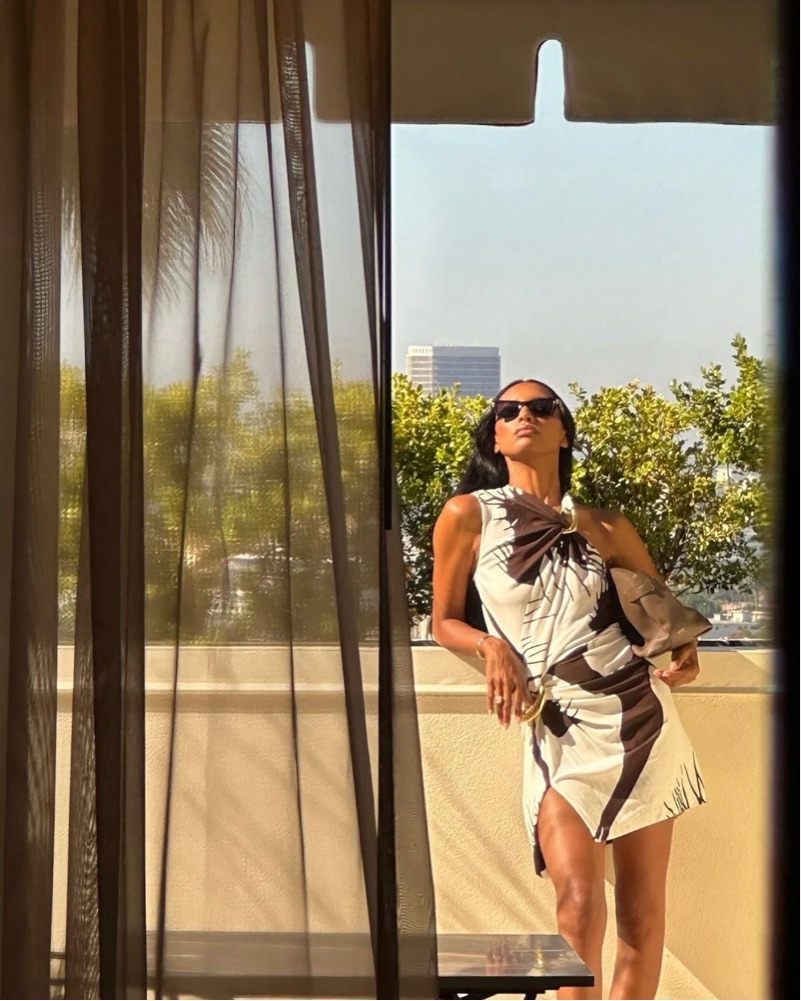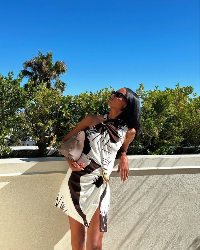 The striking 'Venus' print and sculptural shape of Ferragamo's dress made such a statement on the Spring '24 runway. It's made from stretch-jersey that wraps the figure and has a halter neckline embellished with oversized hardware.