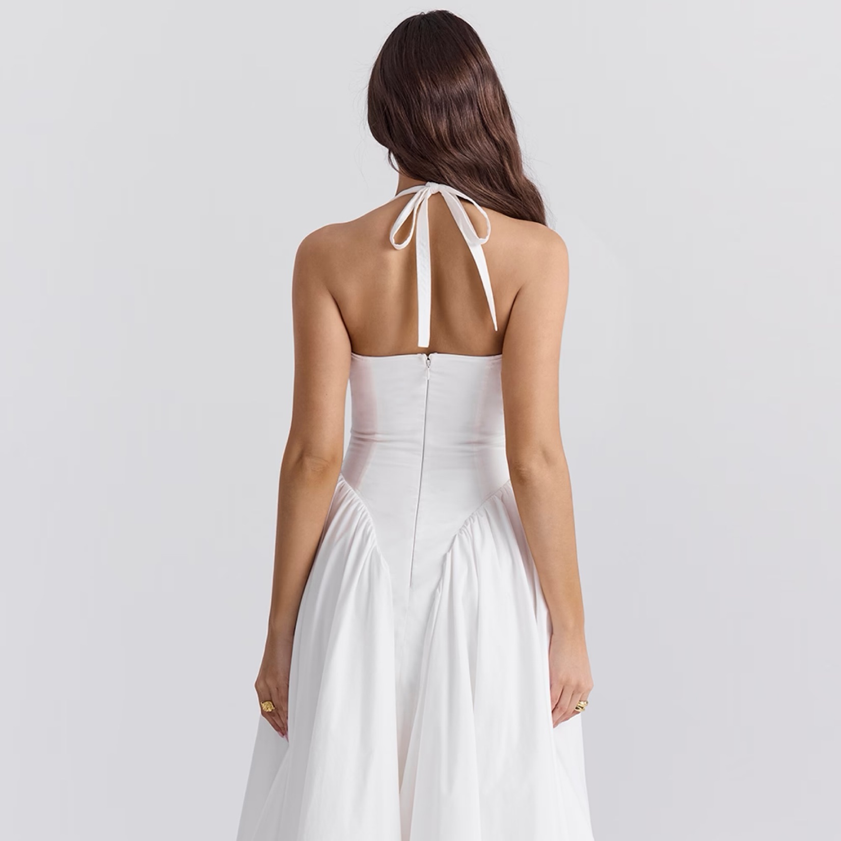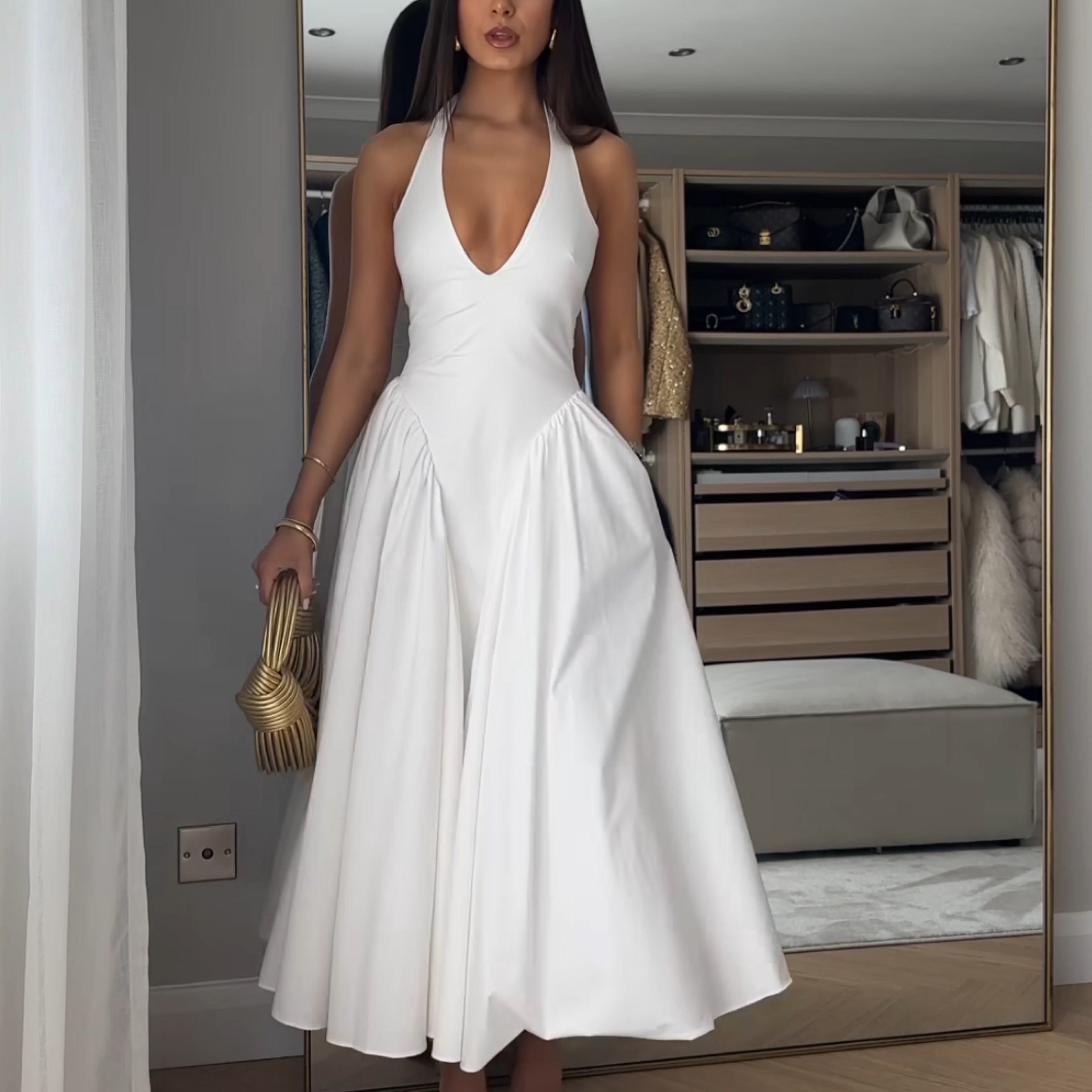 House of Cb white cotton halter midi sundress (S). Marked as S but runs tight and fits like XS. Gorgeous silhouette with a fitted bodice, plunge halter neckline, open back and pockets. Dry clean only and no self tanner - please be careful!