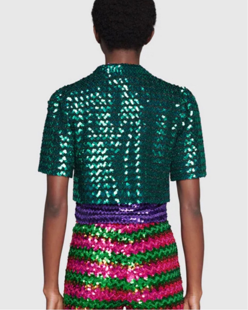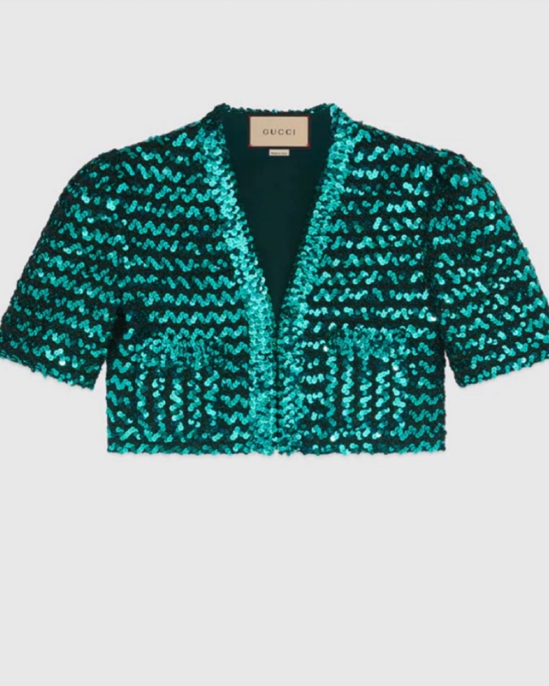 A cropped jacket crafted from green lamé and sequin embroidery. The House’s aesthetic is an ode to the beauty of the past, reworking iconic elements from each decade into the present. For Ouverture, the ‘80s glamour lifestyle influences the choice of sparkling fabrics and sequins, shaping true disco