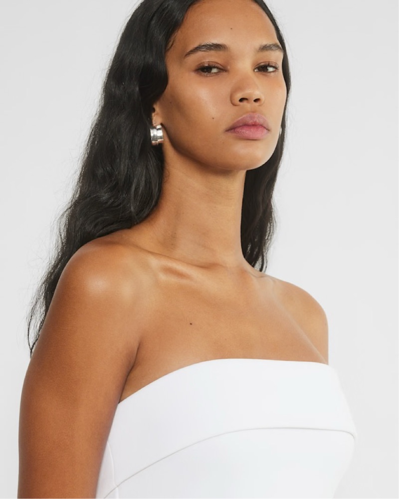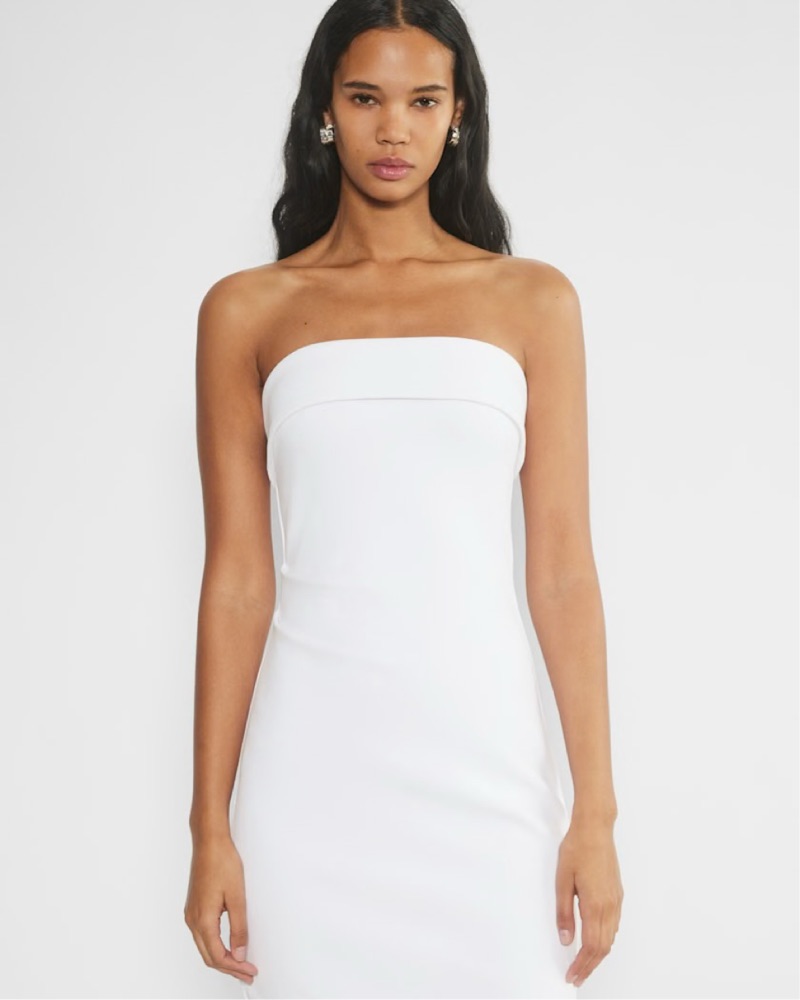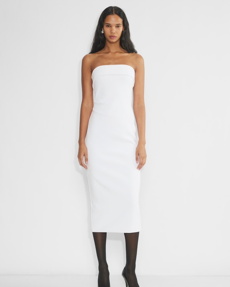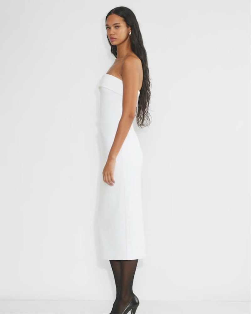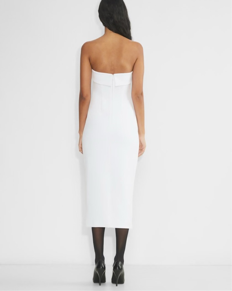 Aritzia BabatonFigureKnit™ Eyecatcher Dress in white. This is a lined strapless dress designed for a slim fit. It's cut from structured, double-layer crepe fabric that delivers superior stretch and shape retention to hug your figure.