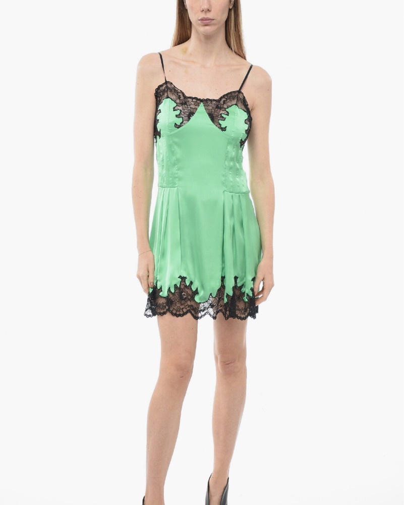 This stunning Paco Rabanne slip dress is a showstopping piece perfect for a night out or special occasion. The vibrant green hue and delicate lace accents create an alluring, feminine look.