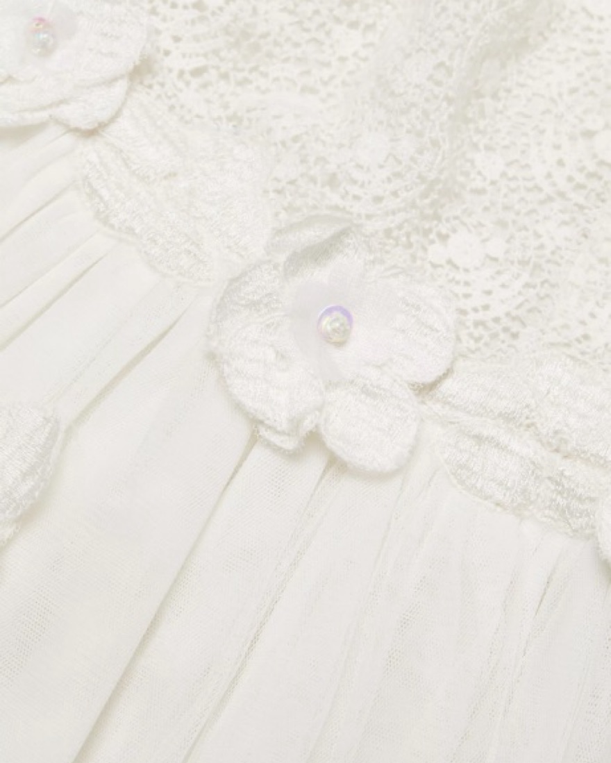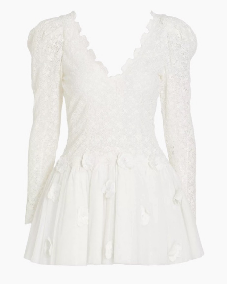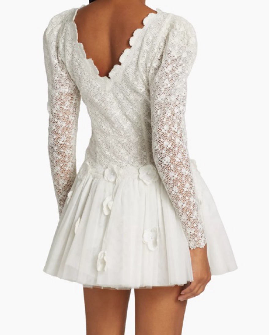 Featuring a lacey long-sleeve bodice, the Veralynne minidress is finished with floral embellishmets at the skirt. Perfect for brides.