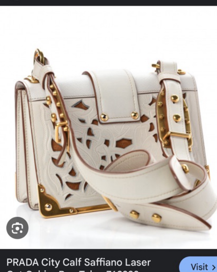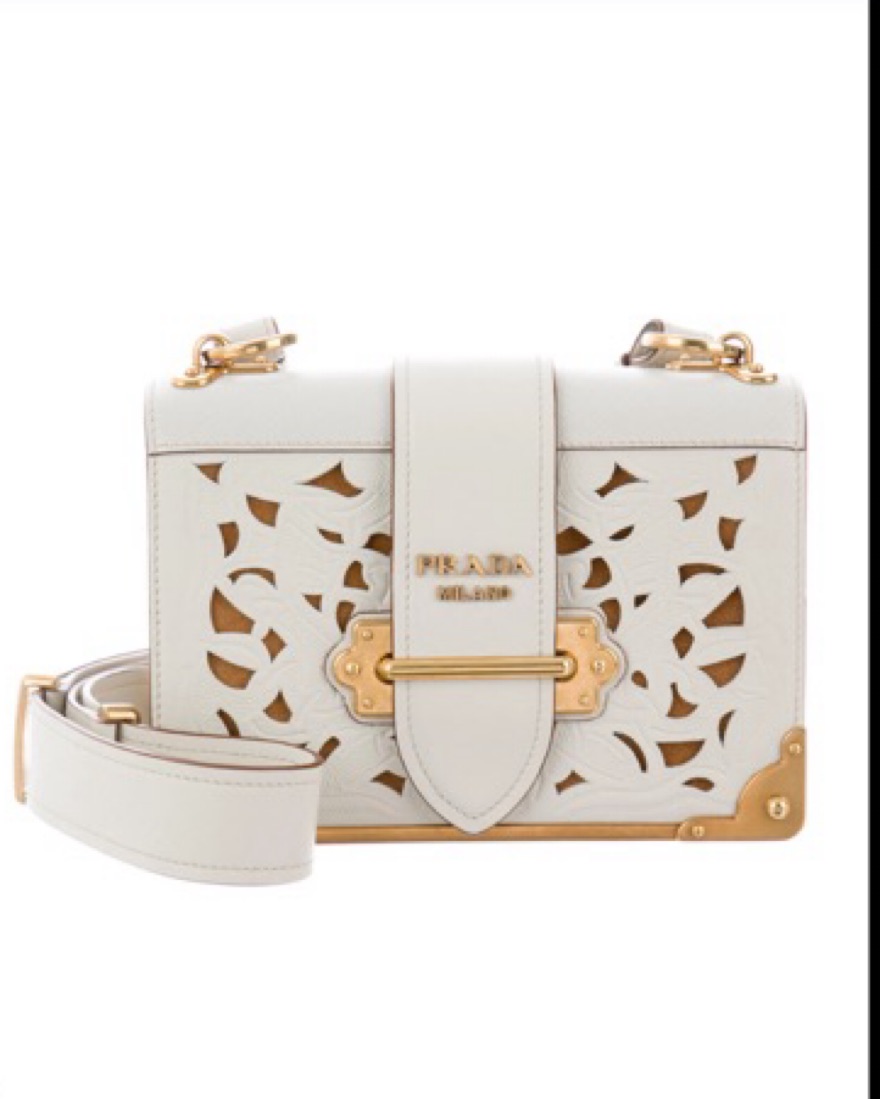 Super pretty floral laser cut out bag from prada. Long crossbody strap