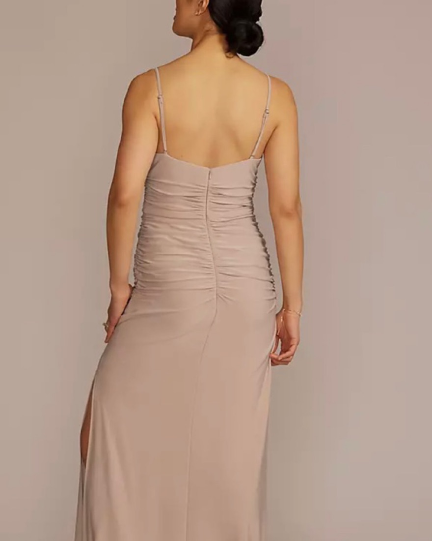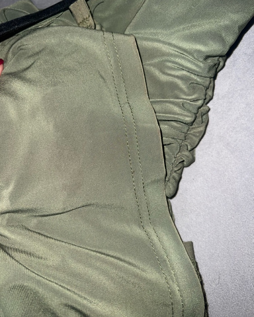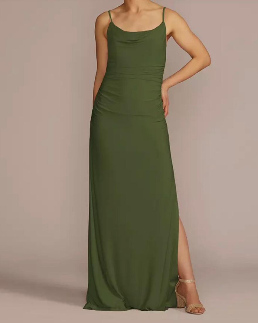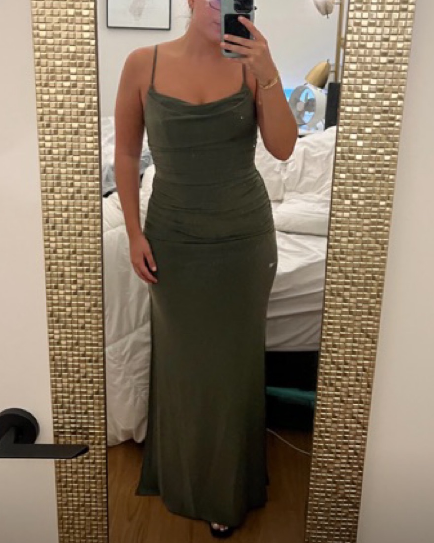Worn once, slight discoloration at bottom from the grass, ruched jersey spaghetti strap bridesmaid dress in martini olive, green bridesmaid dress