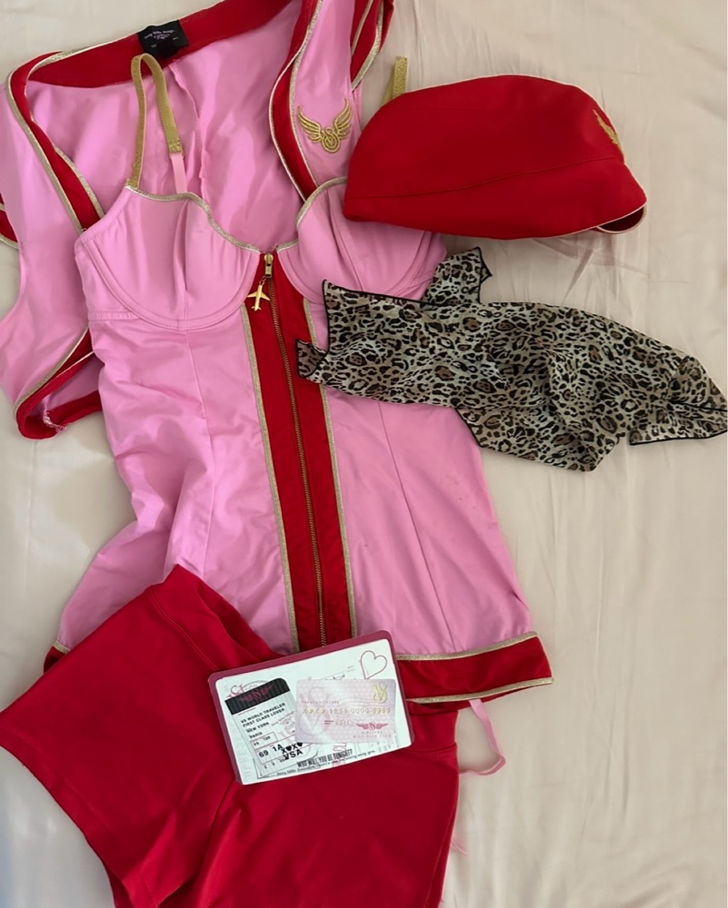 Victoria’s Secret Flight Attendant Costume in pink! Comes with everything pictured and a pair of shorts if you want.