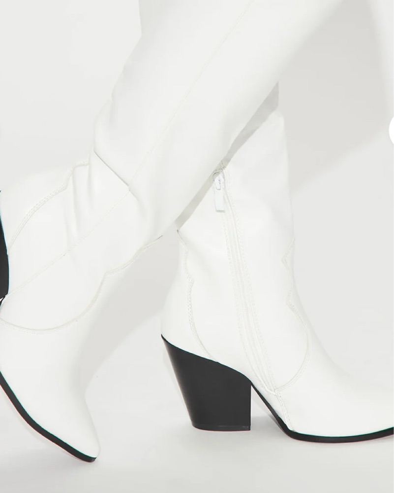 These chic white boots are perfect for an elegant night out. The sleek design and block heel add a touch of sophistication to any outfit. They are very comfy. Easy to walk in.