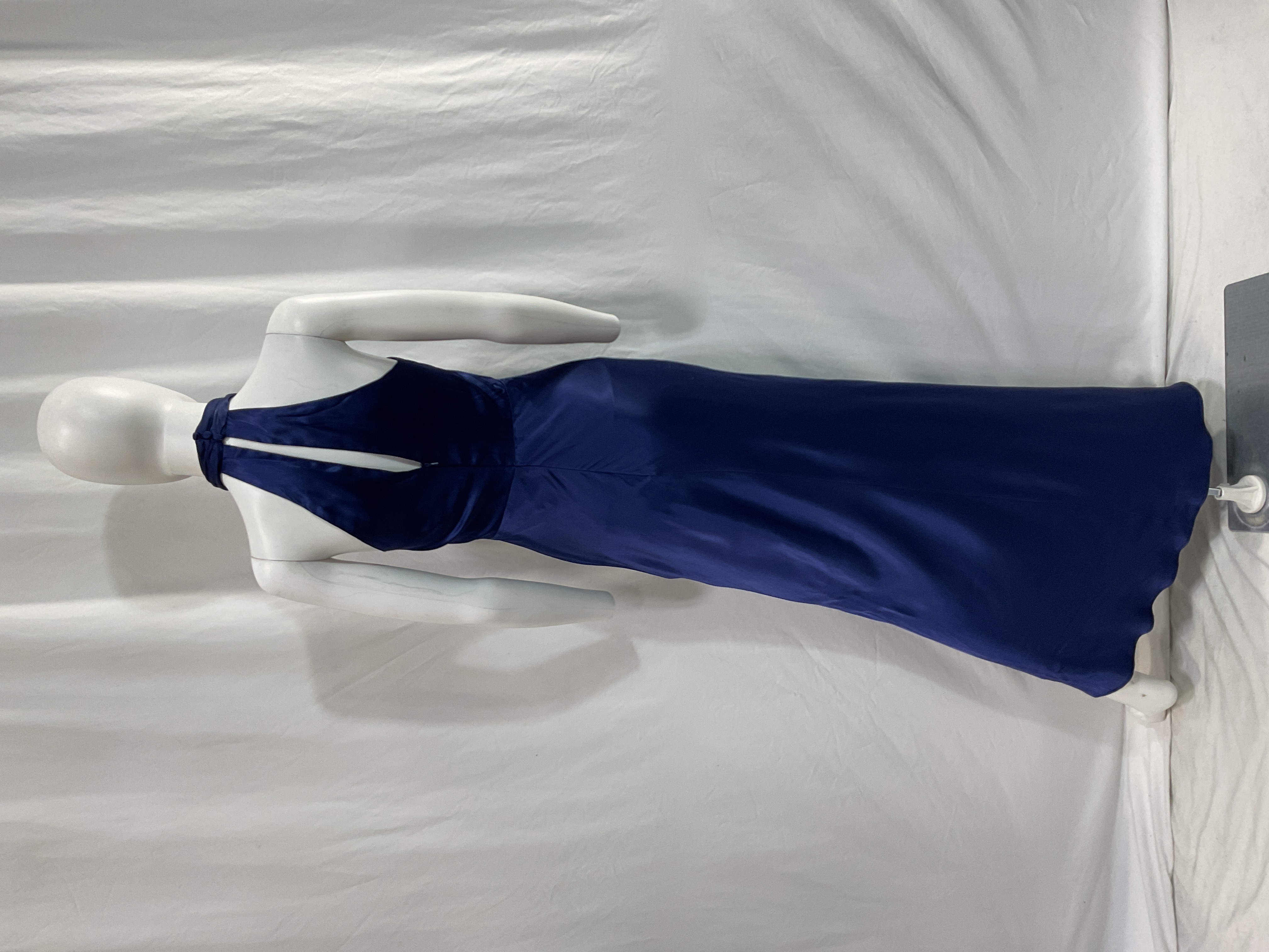Elegant high neck and twist detail create a sophisticated evening look. The rich midnight hue and flowing maxi length are perfect for weddings or formal events.